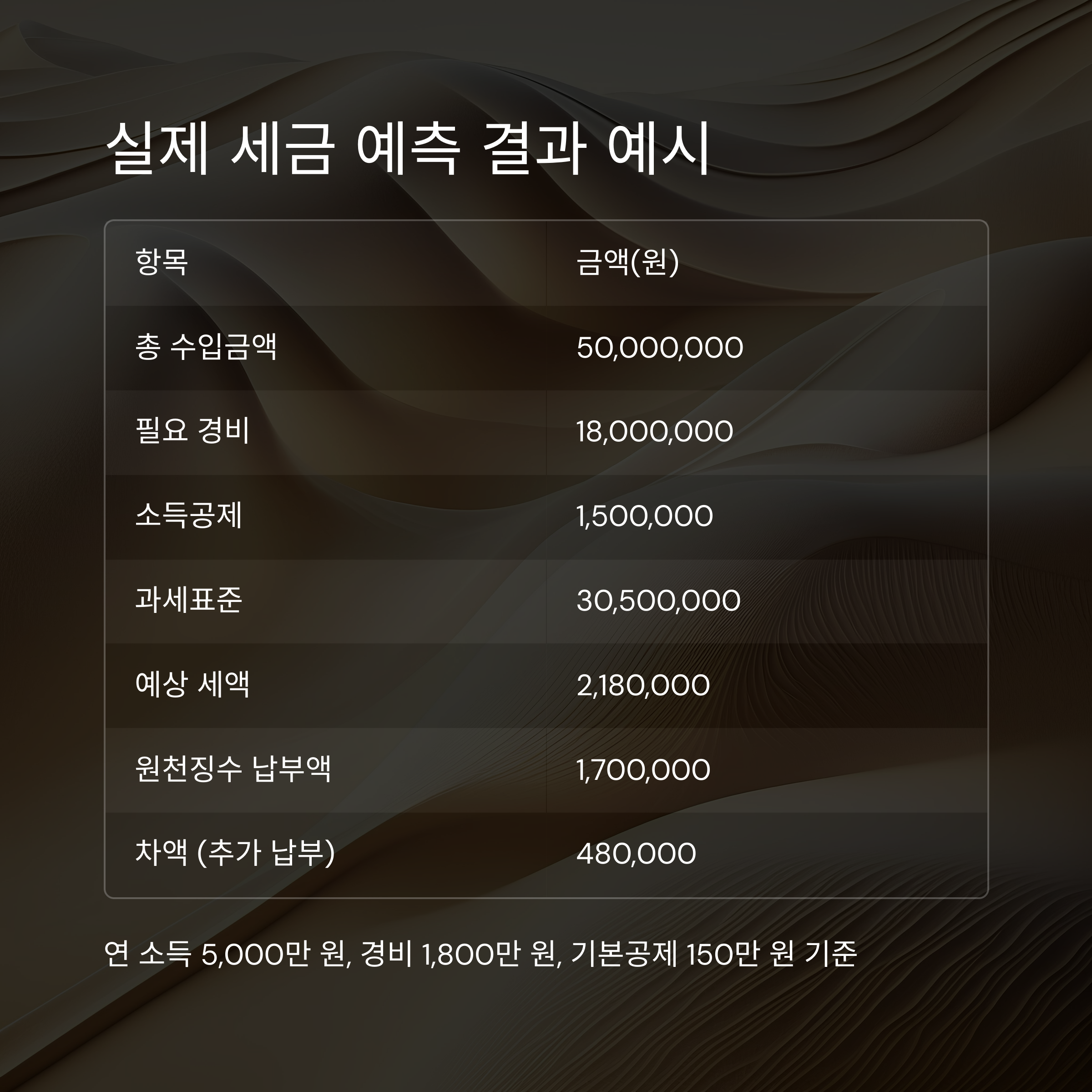 아래는 연 소득 5,000만 원, 경비 1,800만 원, 기본공제 150만 원 기준의 예측 결과입니다
