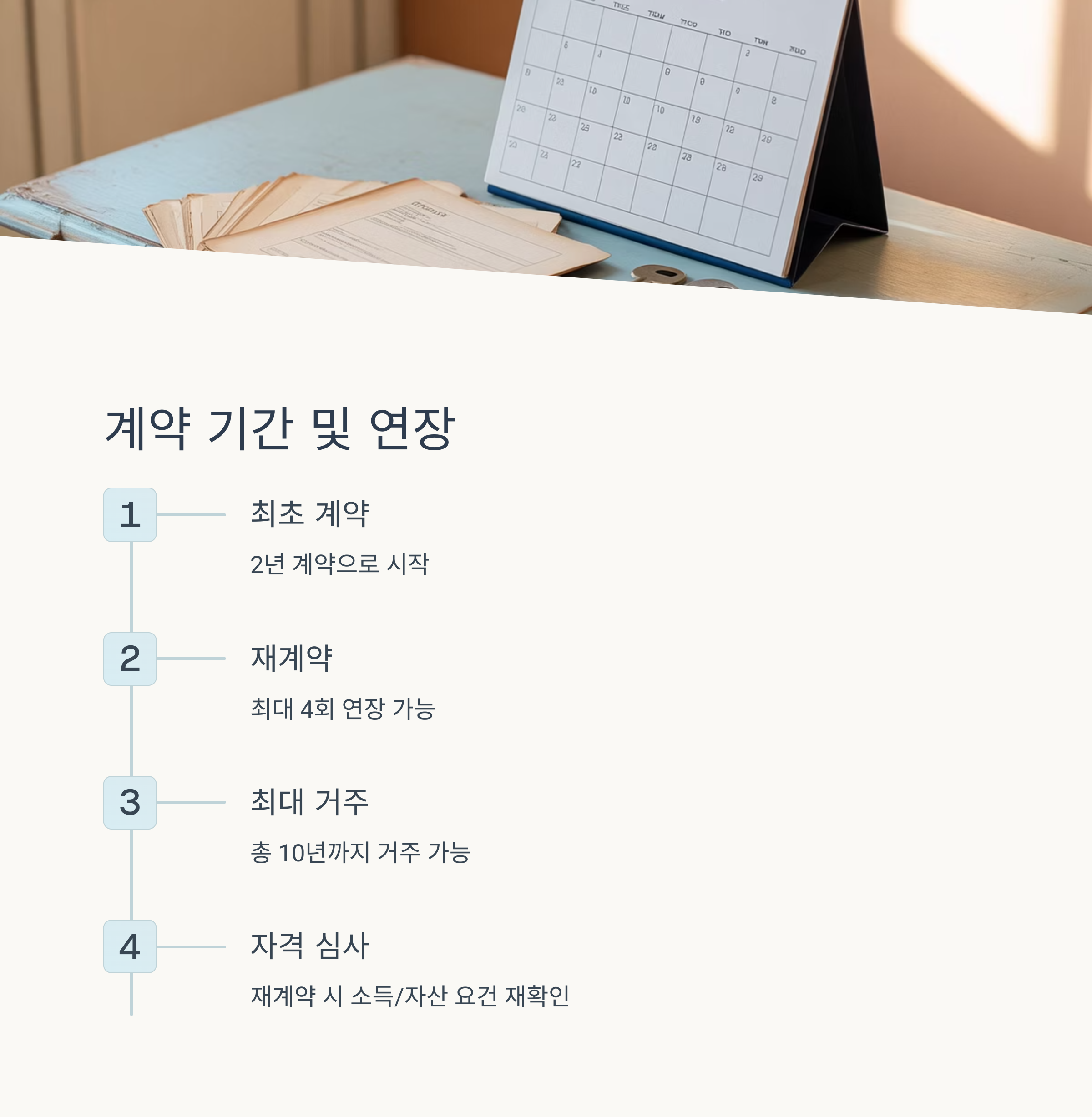 계약 만료일 3개월 전부터 연장 신청이 가능하며, 연장 신청을 하지 않거나 자격 요건을 충족하지 못할 경우 재계약은 불가능합니다. 입주 중 취업이나 자산 증가 등으로 소득 수준이 높아지면 다음 재계약 시 탈락할 수 있으므로 주의해야 합니다.