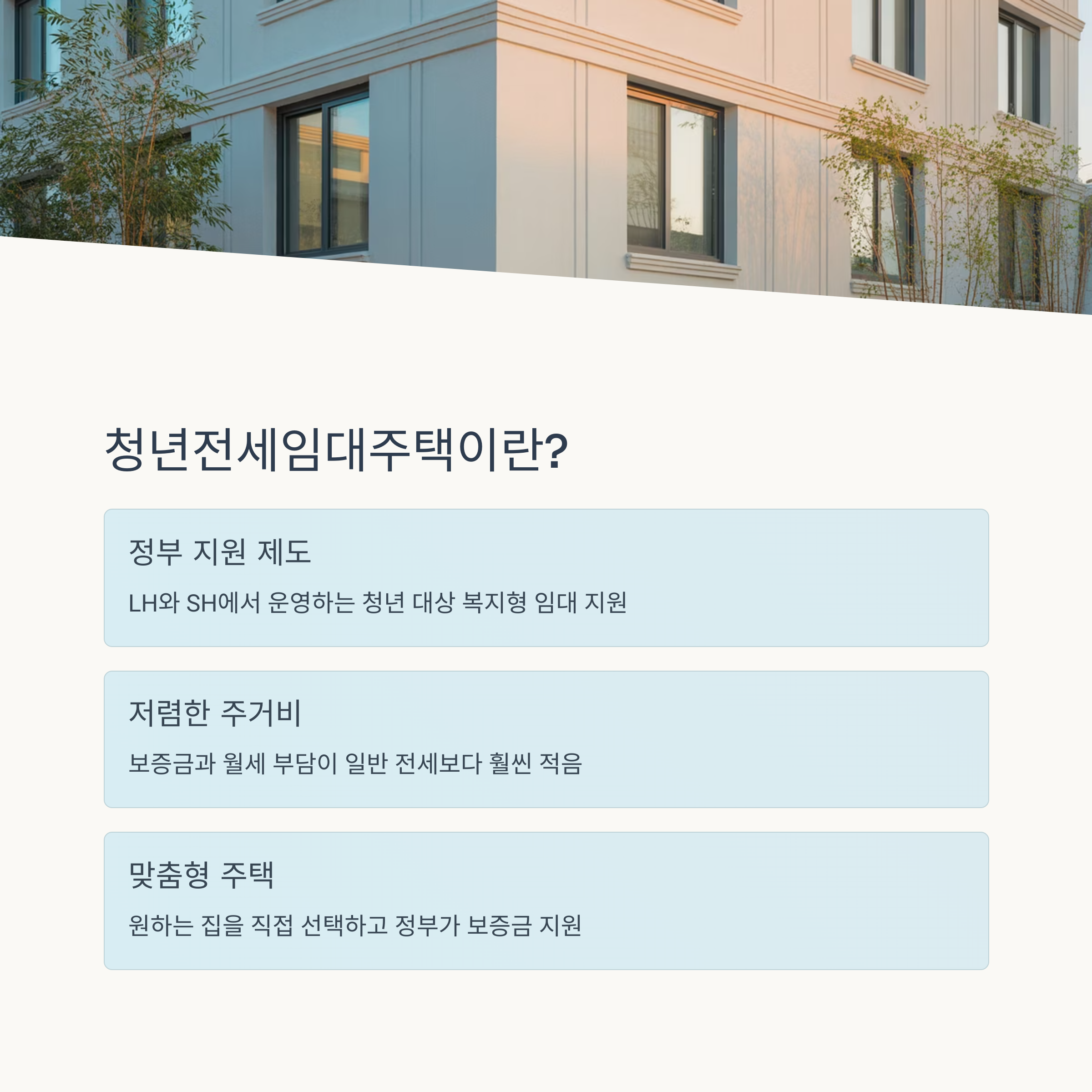 청년전세임대주택은 주거비 부담이 큰 청년들을 위해 한국토지주택공사(LH)와 서울주택도시공사(SH) 등에서 운영하는 복지형 임대 지원 제도입니다. 시세보다 훨씬 저렴한 가격에 원하는 집을 전세로 계약하고, 정부가 보증금을 대신 내주는 구조입니다. 이 제도를 통해 입주하게 되면 보증금이나 월세 부담이 일반 전세로 입주하는 것보다 훨씬 적어집니다. 따라서 자격 요건만 된다면 청년전세임대주택에 들어가는 것이 좋습니다.