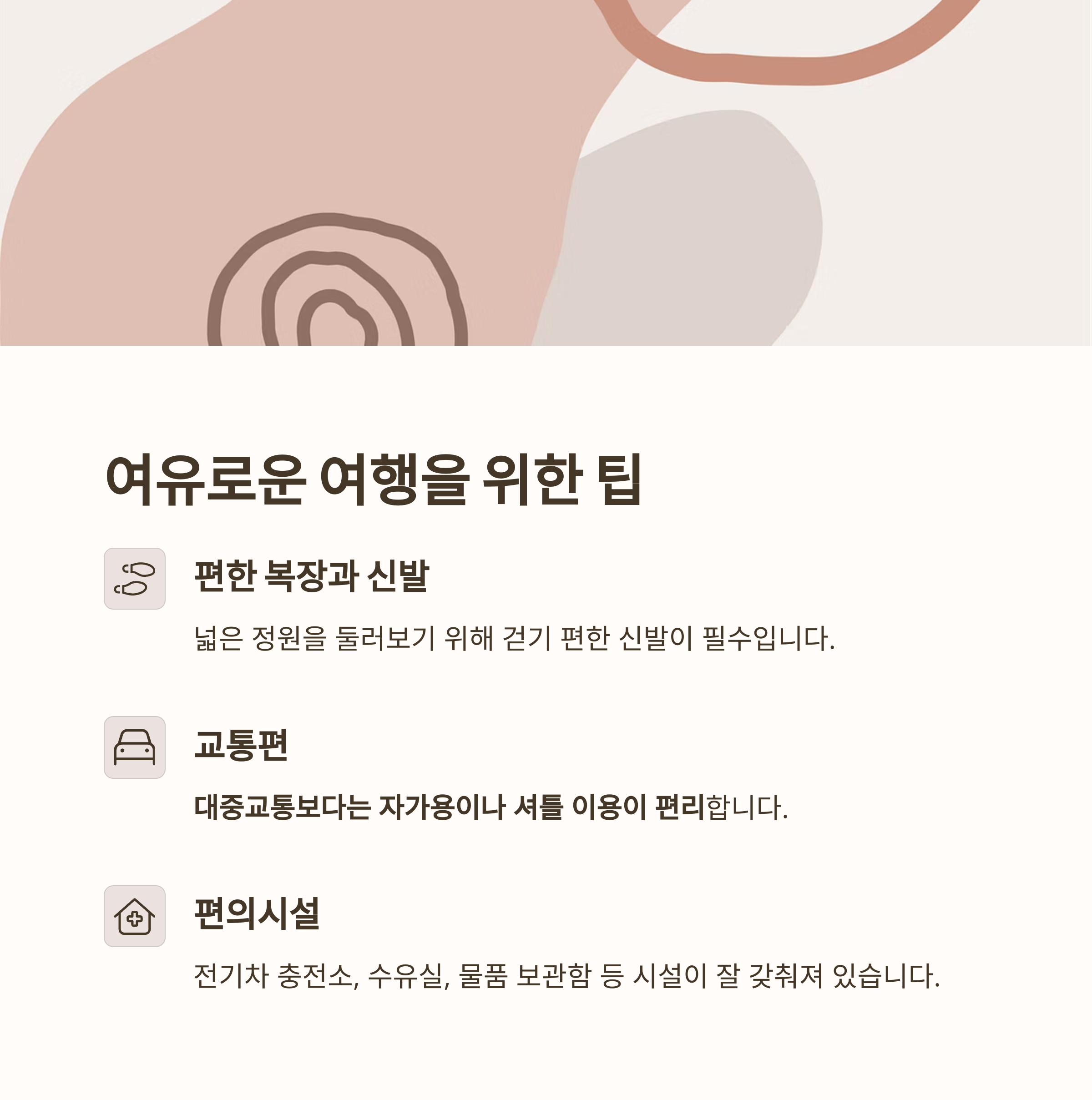 국가정원 관람 시에는 편한 복장과 걷기 좋은 신발이 필수입니다