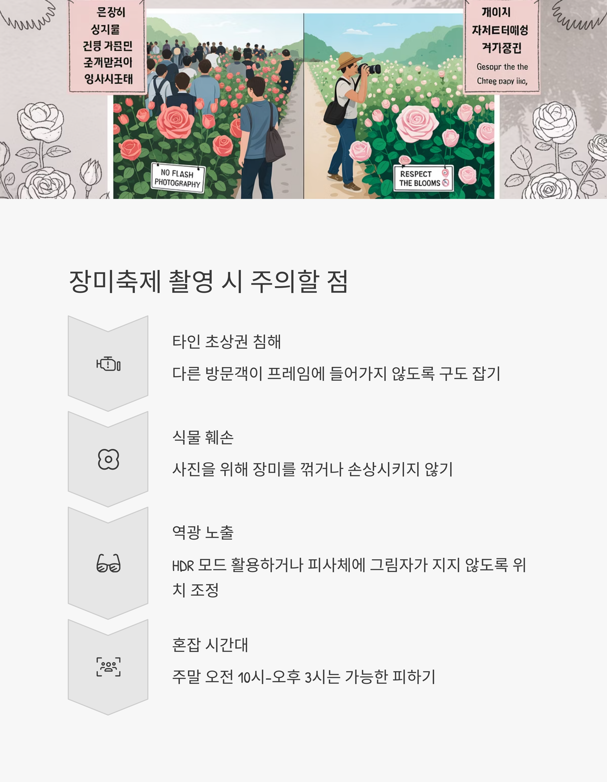 - 장시간 노출 대비: 모자와 선크림은 필수! 장미 그늘도 적극 활용하세요.