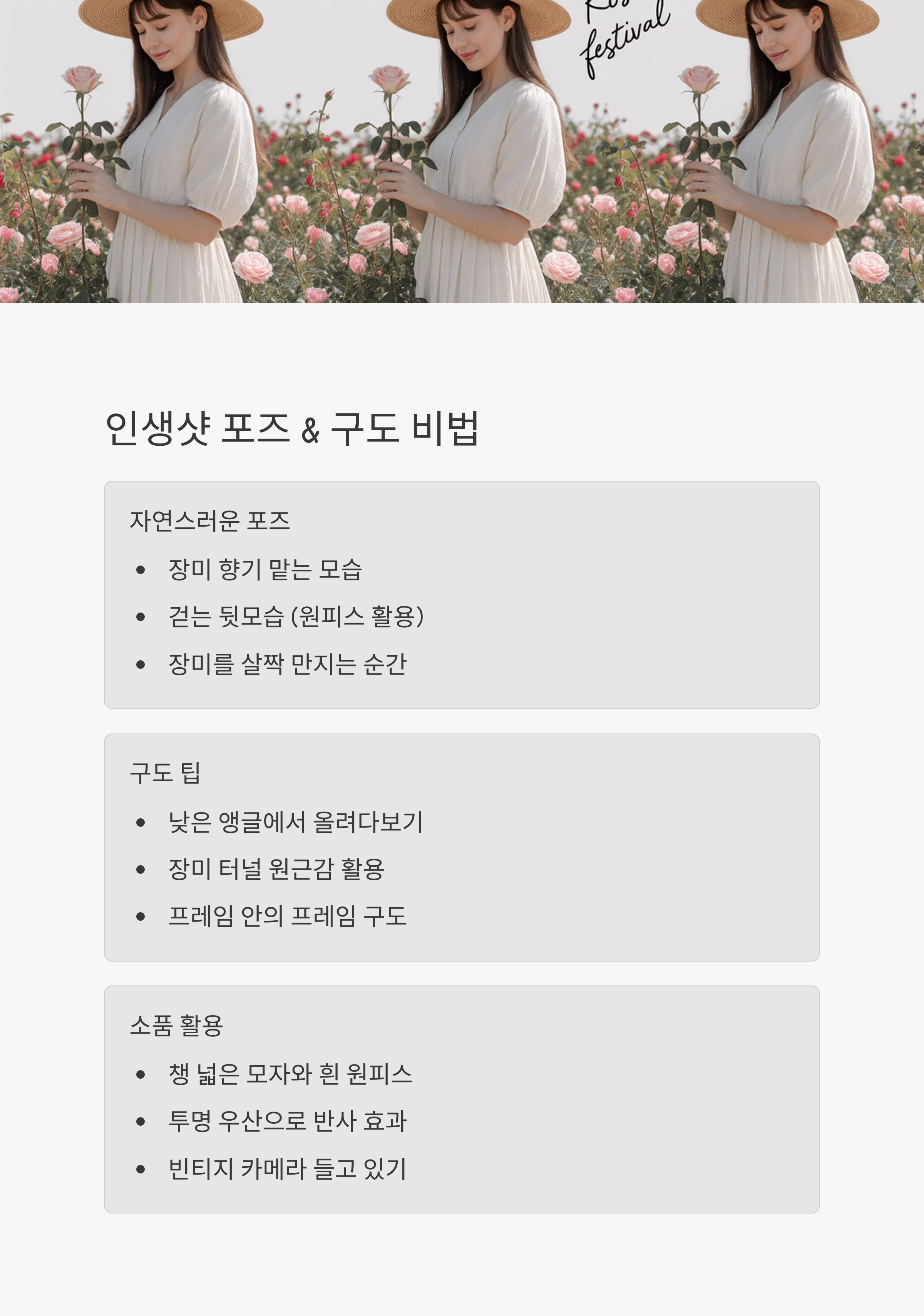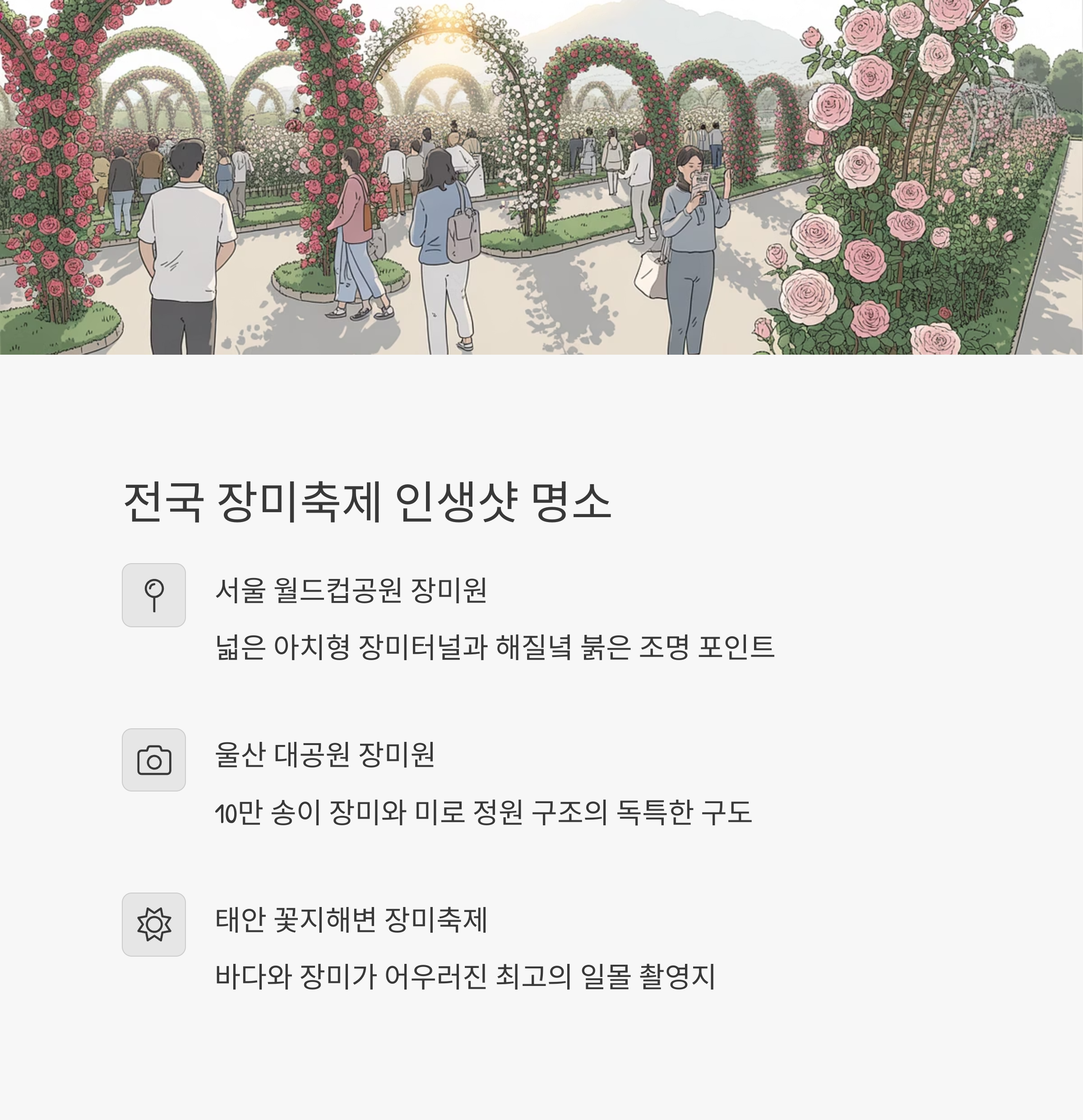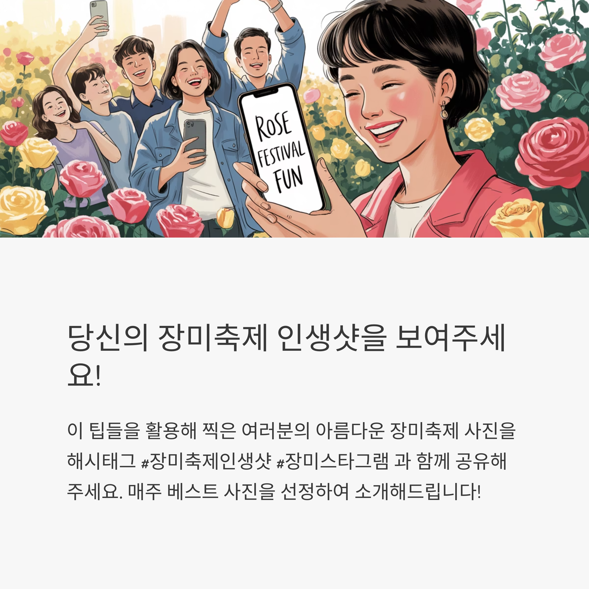 장미축제는 그냥 눈으로만 보는 것도 좋지만, 카메라에 담아 추억으로 남기면 더 오래 기억에 남는 것 같아요. 오늘 소개한 인생샷 명소와 촬영 팁들만 기억해도, 평범한 사진이 전시회 작품처럼 바뀔 수 있답니다. 구도, 빛, 장소의 조화는 물론이고, 자연을 배려하는 마음까지 더한다면 더 아름다운 장면을 만들어낼 수 있어요. 올봄 장미와 함께 나만의 최고의 한 컷, 꼭 남겨보세요. 다음 축제 시즌엔 또 어떤 꽃밭에서 만날지 기대되네요 :)