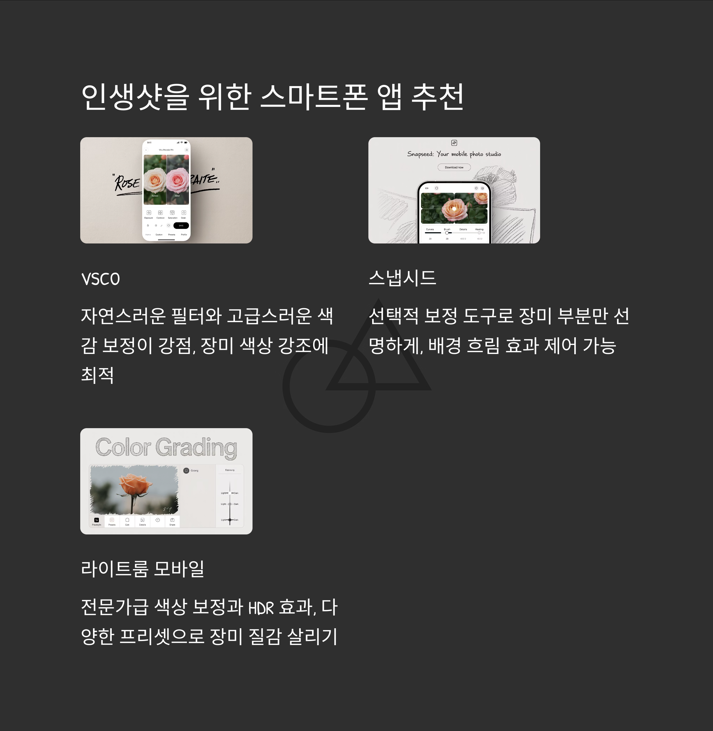 보정은 한두 가지 앱만으로도 충분해요. 너무 과한 필터는 꽃의 자연미를 해치기 때문에 노출, 명도, 채도 정도만 간단히 조절하는 것이 가장 깔끔한 결과를 줘요.