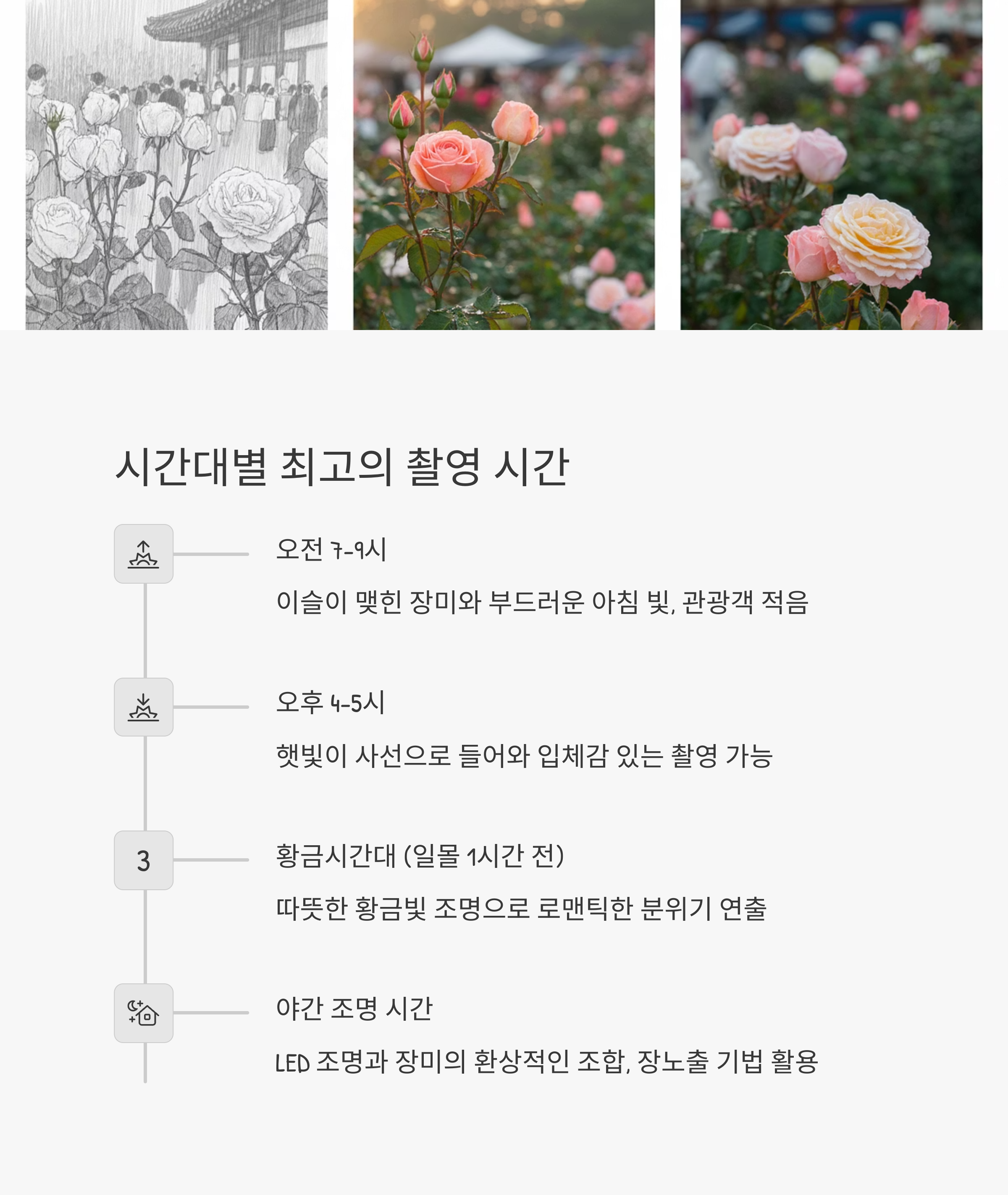 장미축제에서의 촬영은 단순히 “빛 좋은 날”보다, “빛 좋은 시간”이 훨씬 중요해요. 해가 중천에 뜨는 낮 12~3시는 그림자와 노출이 강해 얼굴이 흐리게 나오거나, 잔디와 꽃 색감이 날아가 버리기 쉬워요. 따라서 황금 시간대(Golden Hour)로 불리는 오전 8~10시, 오후 4~6시를 노려보세요.