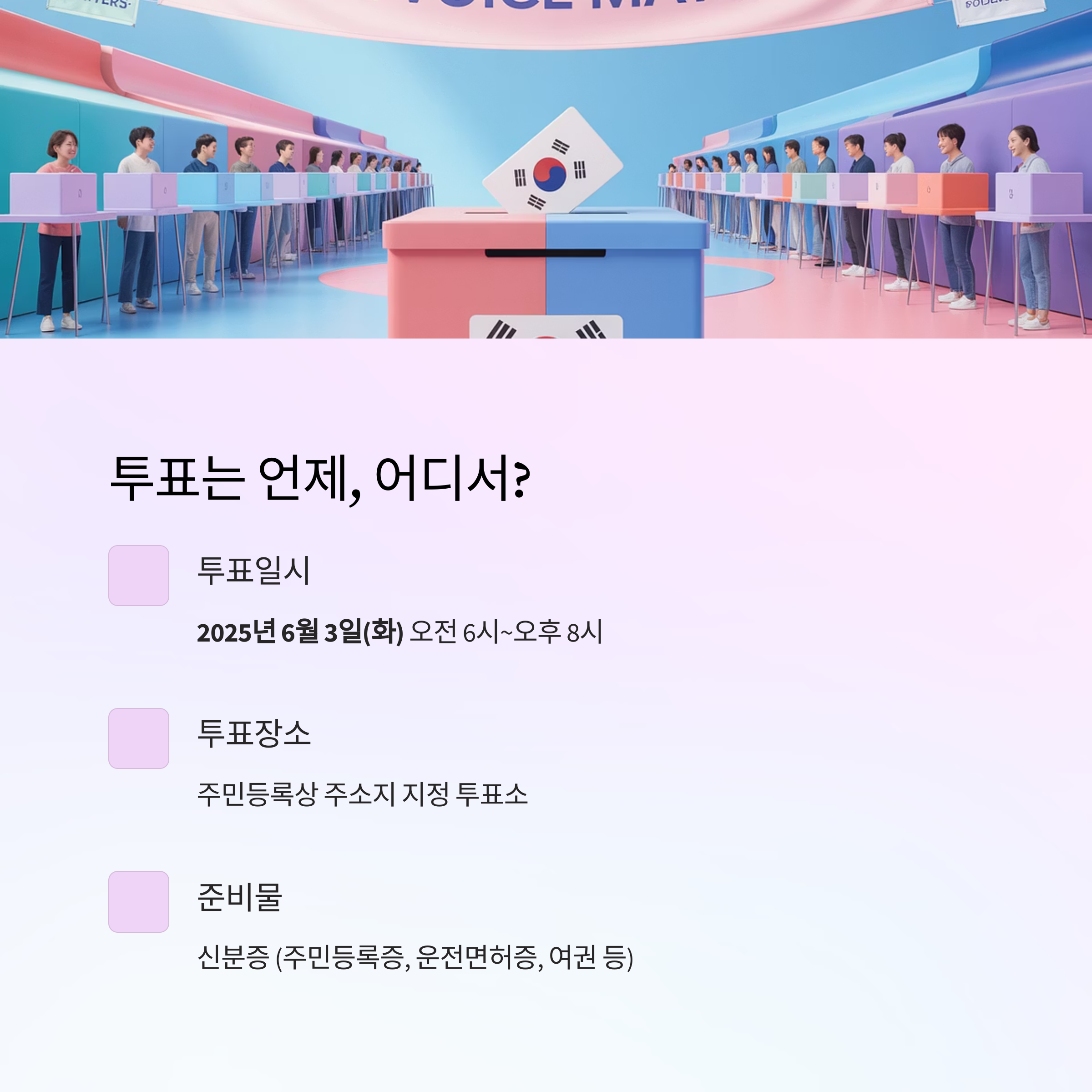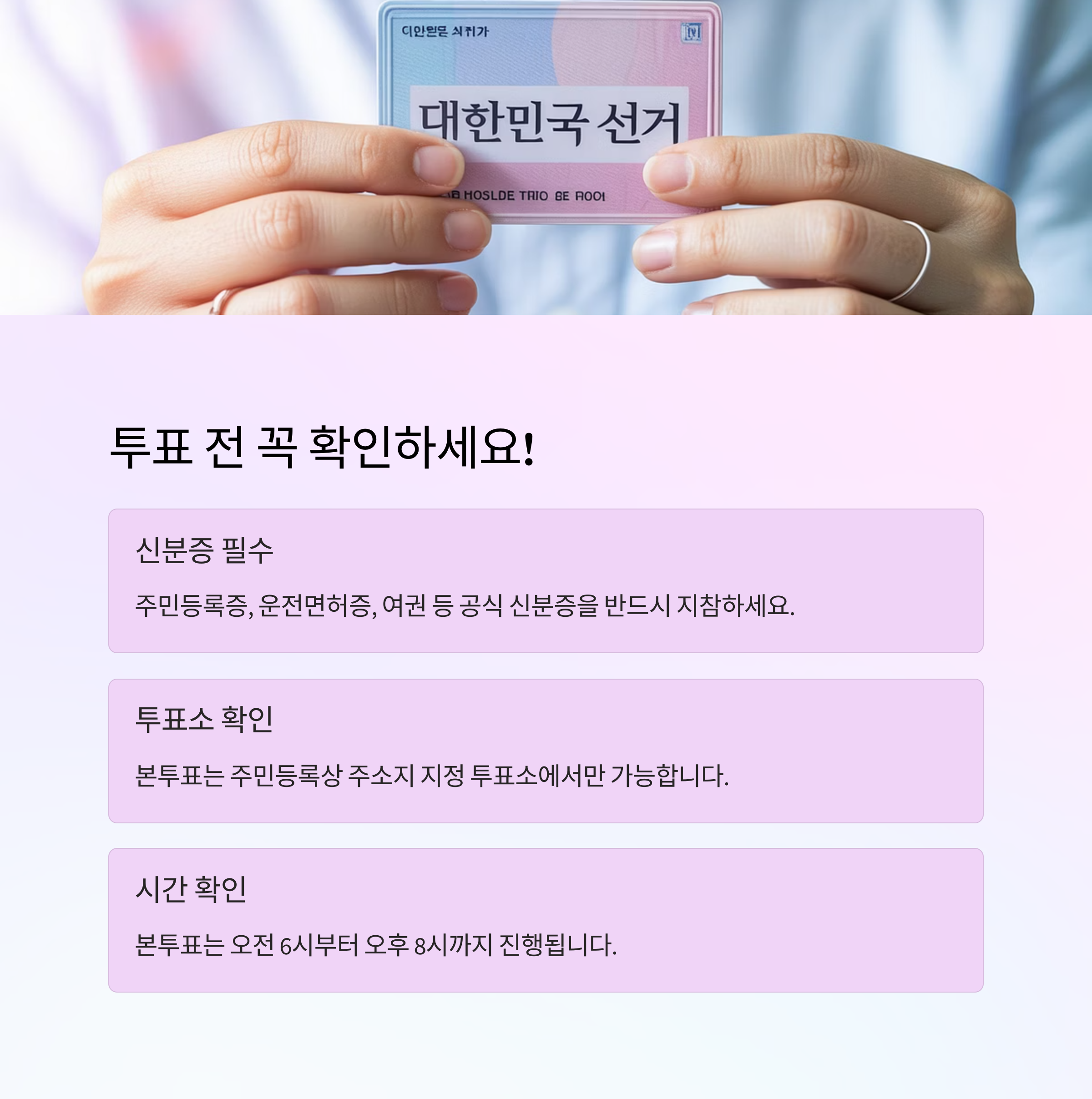 - 지정 투표소 확인: 본투표는 주민등록상 주소지에 해당하는 지정 투표소에서만 가능합니다.