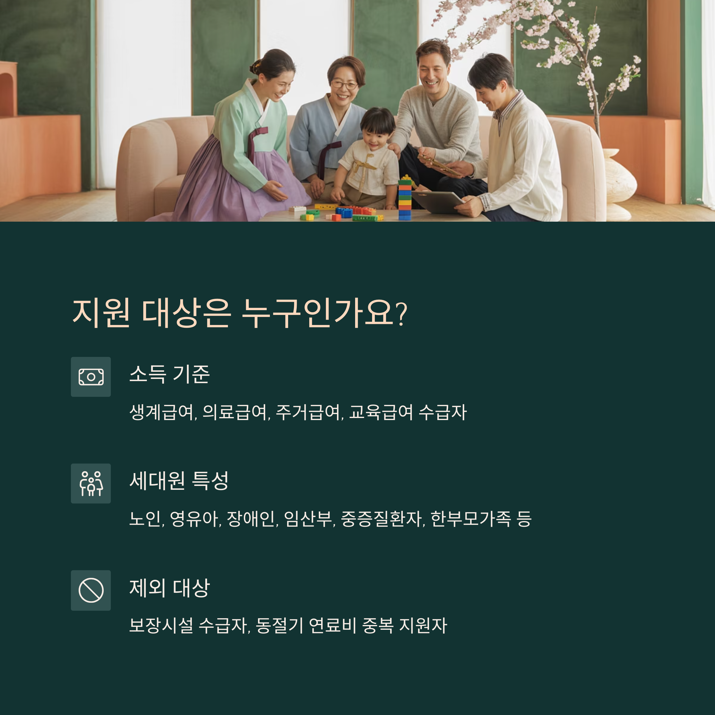 | 지원 제외 대상 | 세대원 모두가 보장시설 수급자 | 에너지바우처 지원 제외 |