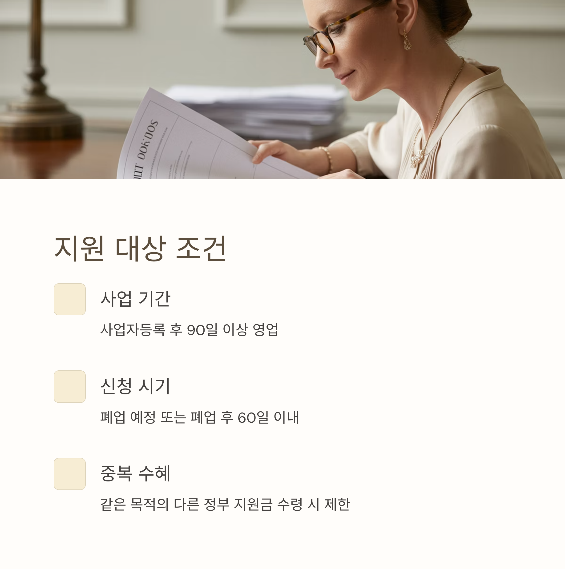 자영업자 폐업 지원금은 일정 조건을 충족하는 소상공인을 대상으로 제공됩니다. 우선, 지원 대상자는 사업자등록 후 90일 이상 영업한 이력이 있어야 하며, 폐업 예정이거나 폐업 후 60일 이내여야 합니다. 특히 임대차계약을 체결한 임차사업장의 경우 점포 철거비 지원과 같은 혜택을 받을 수 있으며, 자영업자 고용보험에 가입되어 있다면 실업급여도 수령 가능합니다. 또한 재기 사업화 지원이나 특화 취업 지원은 재창업 또는 취업 의사가 있는 경우에 한해 신청할 수 있습니다.