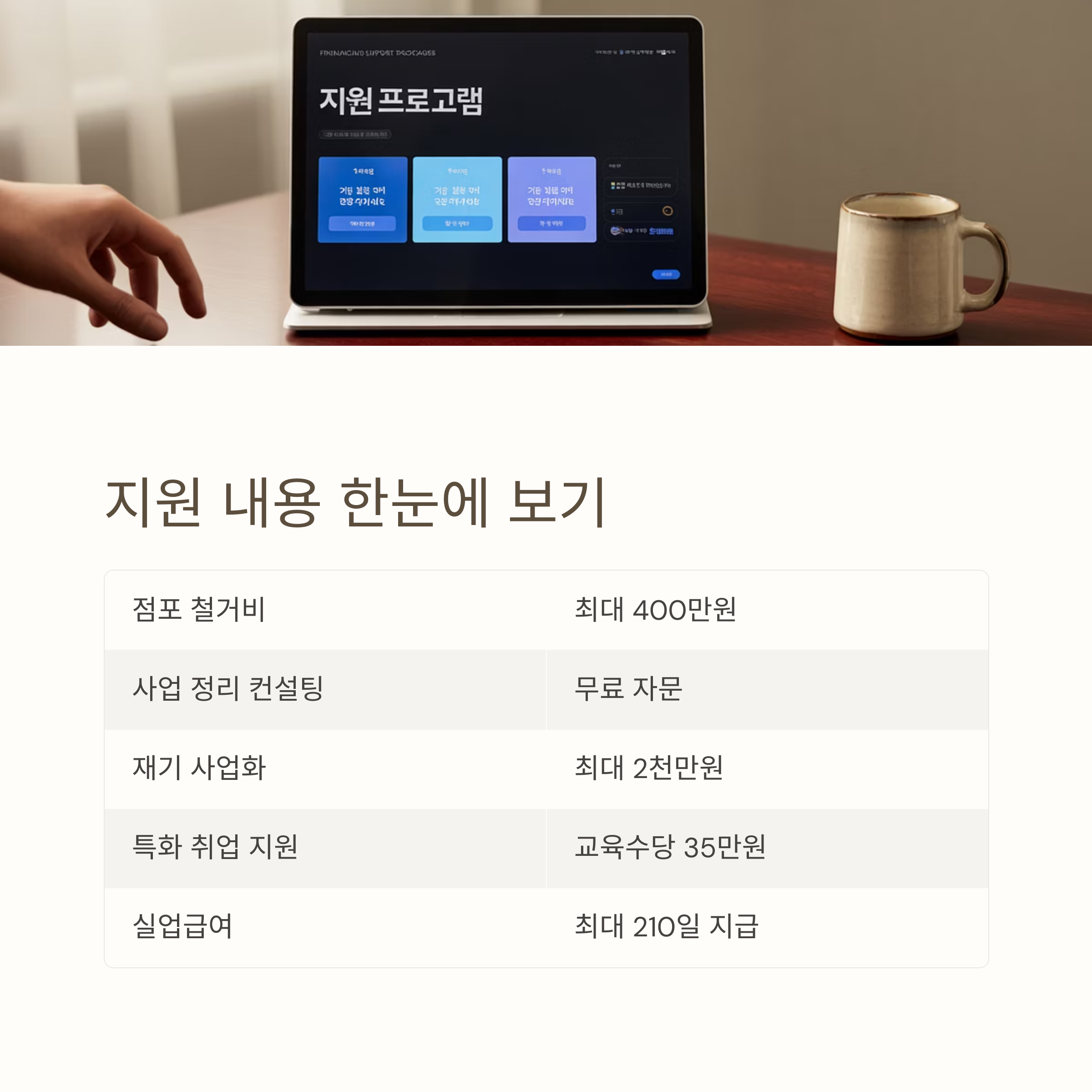 | 점포 철거비 지원 | 폐업일 전후 60일 이내, 임차사업장 운영 | 전용면적 3.3㎡당 최대 8만원, 최대 400만원 |