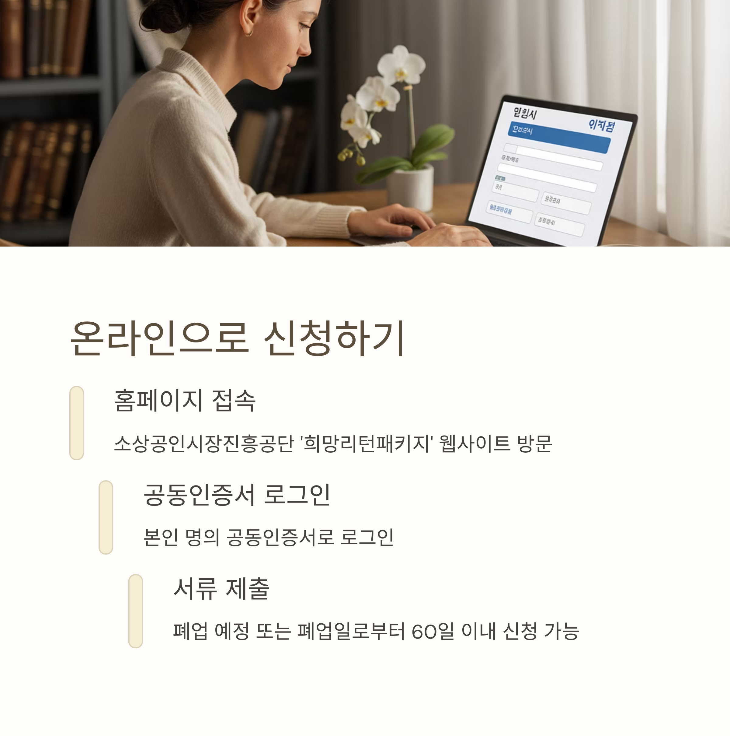 자영업자 폐업 지원금은 주로 소상공인시장진흥공단에서 운영하는 '희망리턴패키지'를 통해 신청할 수 있습니다. 신청자는 해당 홈페이지(https://www.sbiz.or.kr)를 통해 온라인으로 접속한 후, 본인 명의의 공동인증서를 이용해 로그인합니다. 이후 폐업 예정 혹은 폐업일로부터 60일 이내의 조건을 충족하는 경우, 관련 사업을 선택하고 필요한 서류를 첨부하여 신청 절차를 완료할 수 있습니다. 신청 완료 후에는 각 지역의 수행기관에서 자격 심사와 현장 확인 등의 절차가 진행됩니다.