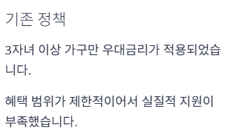 A. 기존에는 3자녀 이상 가구에만 적용되던 다자녀 우대금리가 이제 2자녀 가구부터 적용됩니다. 2자녀 가구는 0.5%p, 3자녀 이상 가구는 0.7% p의 우대금리를 받을 수 있습니다.