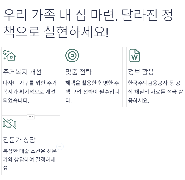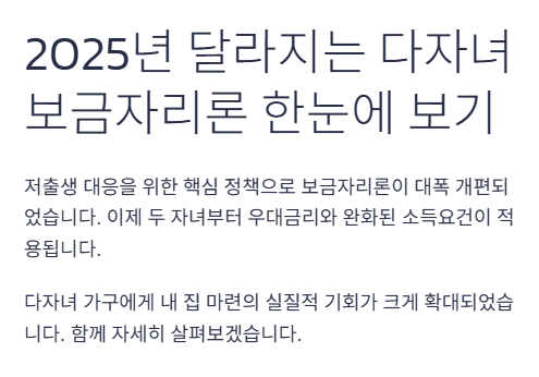 내 집 마련의 꿈은 모두에게 소중하지만, 특히 다자녀 가구에게는 더욱 큰 보금자리가 필요한 만큼 고민도 커질 수밖에 없는데요. 희소식이 있습니다! 정부가 저출생 문제에 적극 대응하기 위해 다자녀 가구 보금자리론 지원을 대폭 확대했습니다. 이제 두 자녀 가구부터 보금자리론 우대금리 혜택을 받을 수 있게 되었고, 소득 요건도 완화되었어요. 게다가 소상공인, 비수도권 주택 소유자, 상속·증여로 주택을 취득하는 경우에도 생활안정자금 신청이 가능해졌답니다. 2025년 4월 1일부터 시행되는 새로운 보금자리론 요건! 저와 함께 어떤 변화가 있는지 꼼꼼히 살펴보면서 우리 가족의 더 나은 미래를 위한 현명한 주택 마련 계획을 세워 보아요!