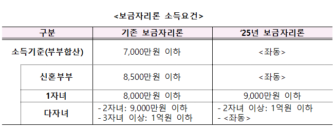 | 구분 | 기존 보금자리론 (부부합산 소득) | '25년 보금자리론 (부부합산 소득) |