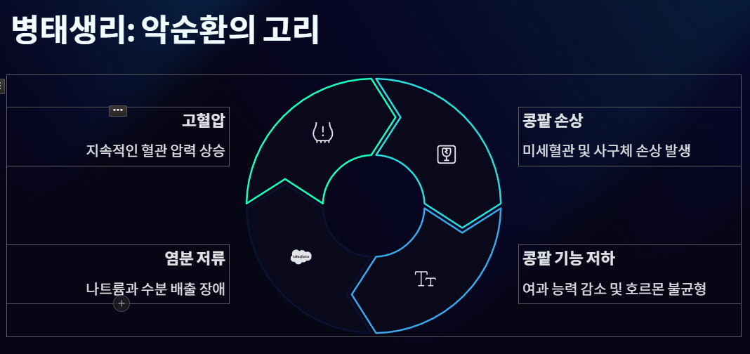 - 콩팥 기능 저하의 가속화: 손상된 사구체는 노폐물을 제대로 걸러내지 못하고, 염분과 수분을 효과적으로 배출하지 못하게 됩니다. 체내에 축적된 염분과 수분은 다시 혈액량을 증가시켜 혈압을 더욱 상승시키는 악순환을 반복합니다. 실제로 만성 콩팥병 환자의 약 85%에서 고혈압이 동반되며, 고혈압이 잘 조절되지 않으면 콩팥 기능 저하가 더욱 가속화되어 결국 말기 신부전으로 이어질 수 있습니다.