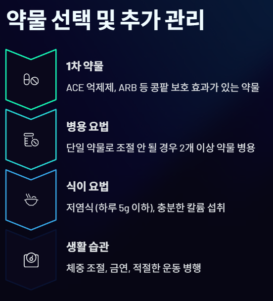 고혈압이 콩팥을 손상시키는 것을 예방하거나 이미 시작된 손상의 진행을 늦추기 위해서는 다음과 같은 통합적인 관리가 필수적입니다.