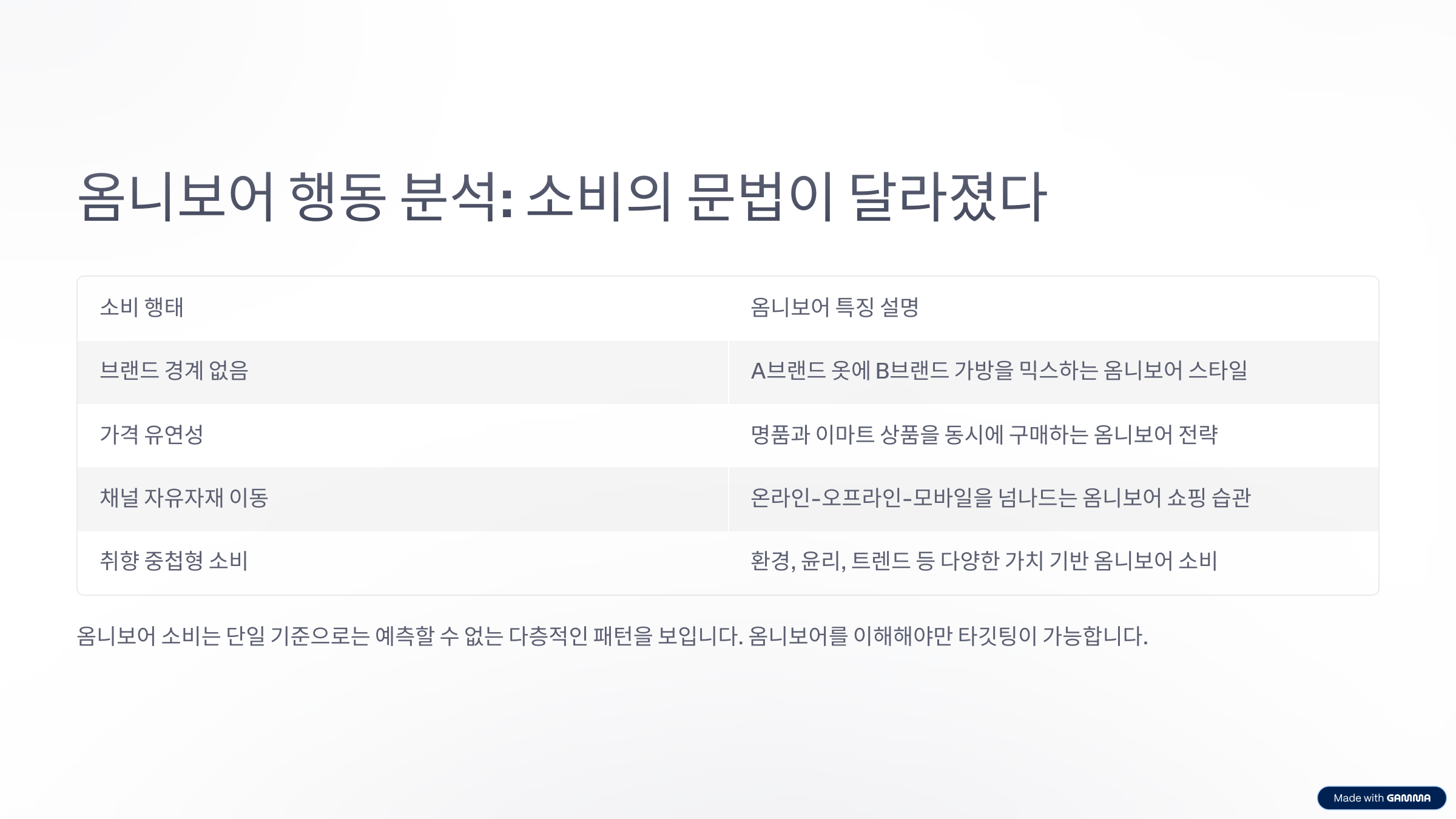| 취향 중첩형 소비 | 환경, 윤리, 트렌드 등 다양한 가치 기반 옴니보어 소비 |