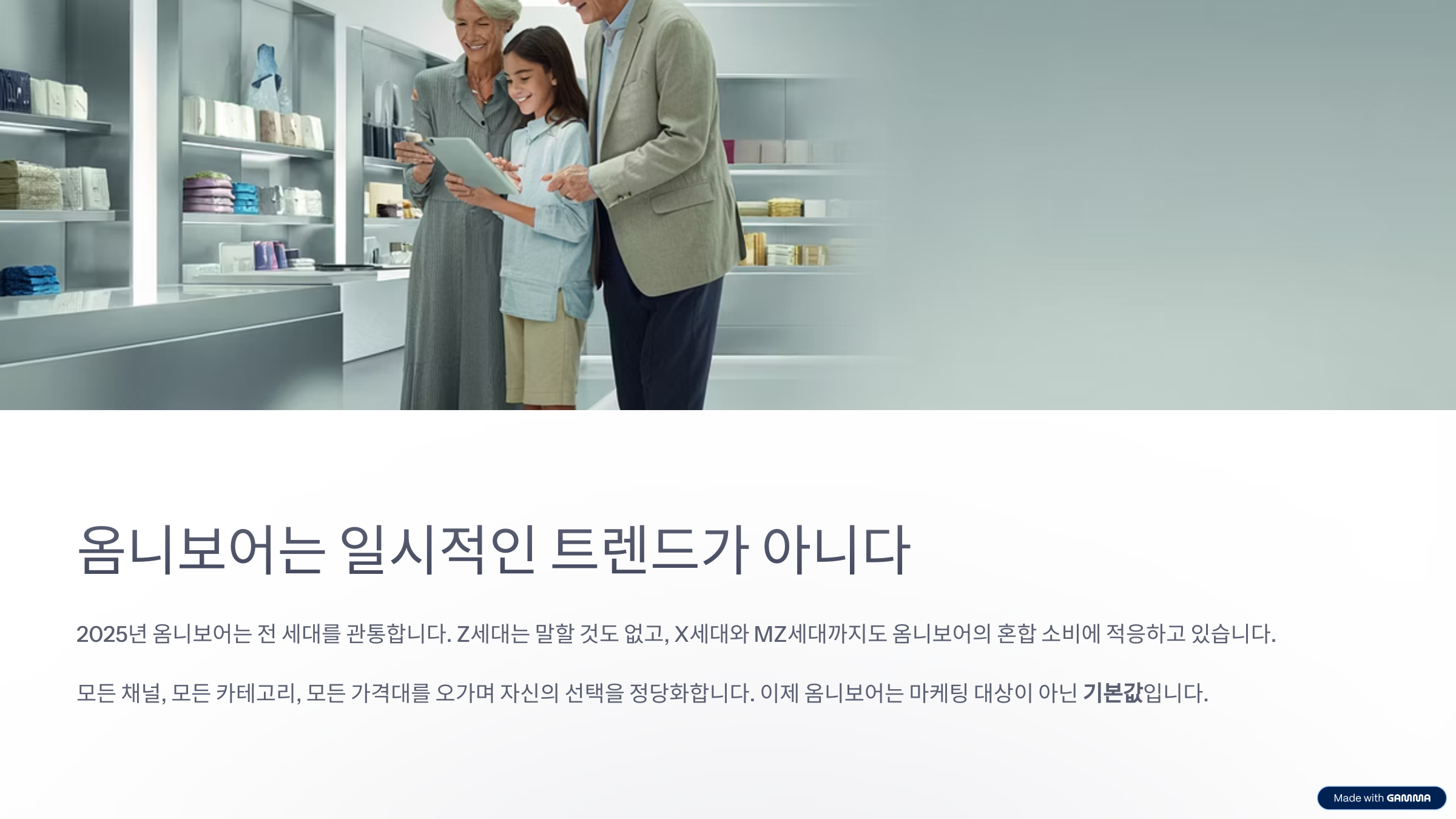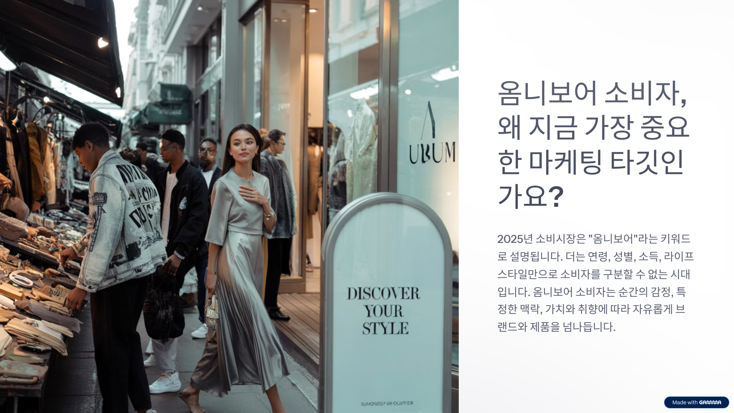 2025년 옴니보어는 전 세대를 관통합니다. Z세대는 말할 것도 없고, X세대와 MZ세대까지도 옴니보어의 혼합 소비에 적응하고 있습니다. 모든 채널, 모든 카테고리, 모든 가격대를 오가며 자신의 선택을 정당화합니다. 이제 옴니보어는 마케팅 대상이 아닌 기본값입니다.