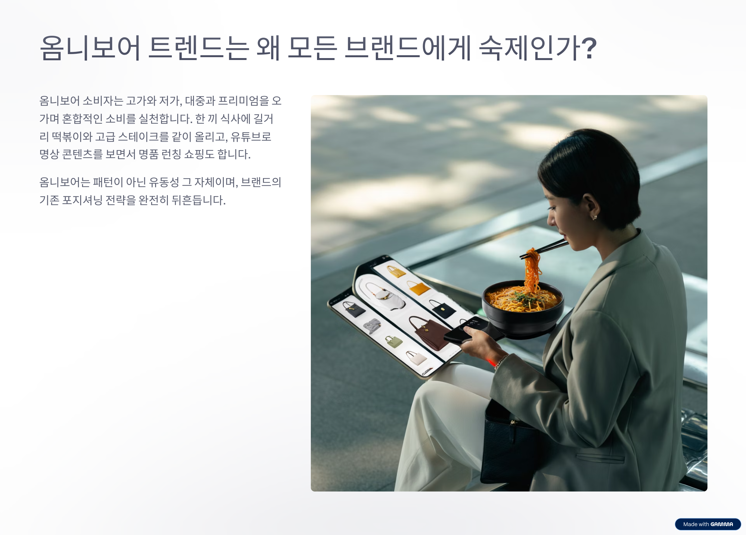 옴니보어 소비자는 고가와 저가, 대중과 프리미엄을 오가며 혼합적인 소비를 실천합니다. 한 끼 식사에 길거리 떡볶이와 고급 스테이크를 같이 올리고, 유튜브로 명상 콘텐츠를 보면서 명품 런칭 쇼핑도 합니다. 이처럼 옴니보어는 패턴이 아닌 유동성 그 자체입니다. 옴니보어의 존재는 브랜드의 기존 포지셔닝 전략을 완전히 뒤흔듭니다.