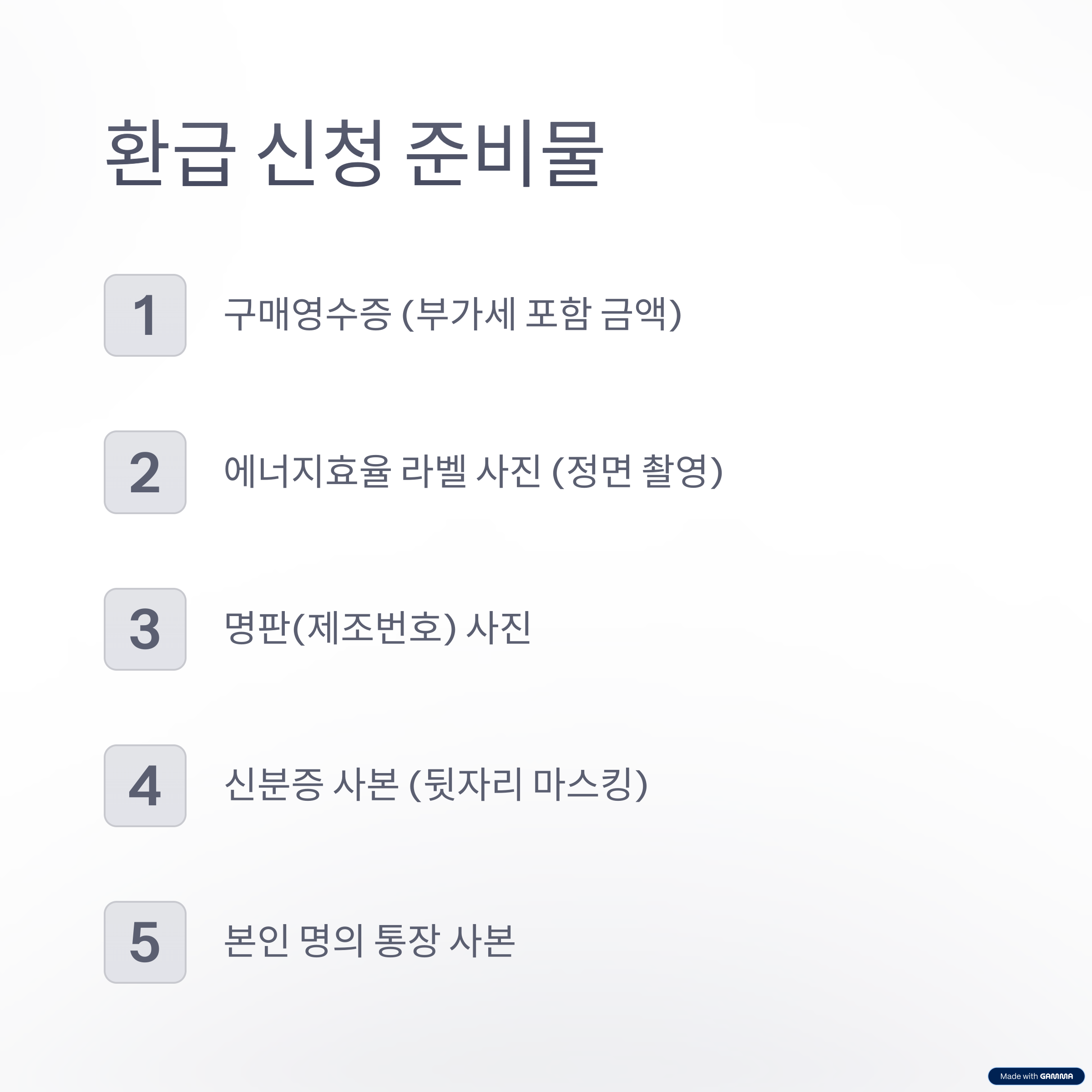 필요서류 영수증, 에너지라벨, 명판, 신분증, 통장사본