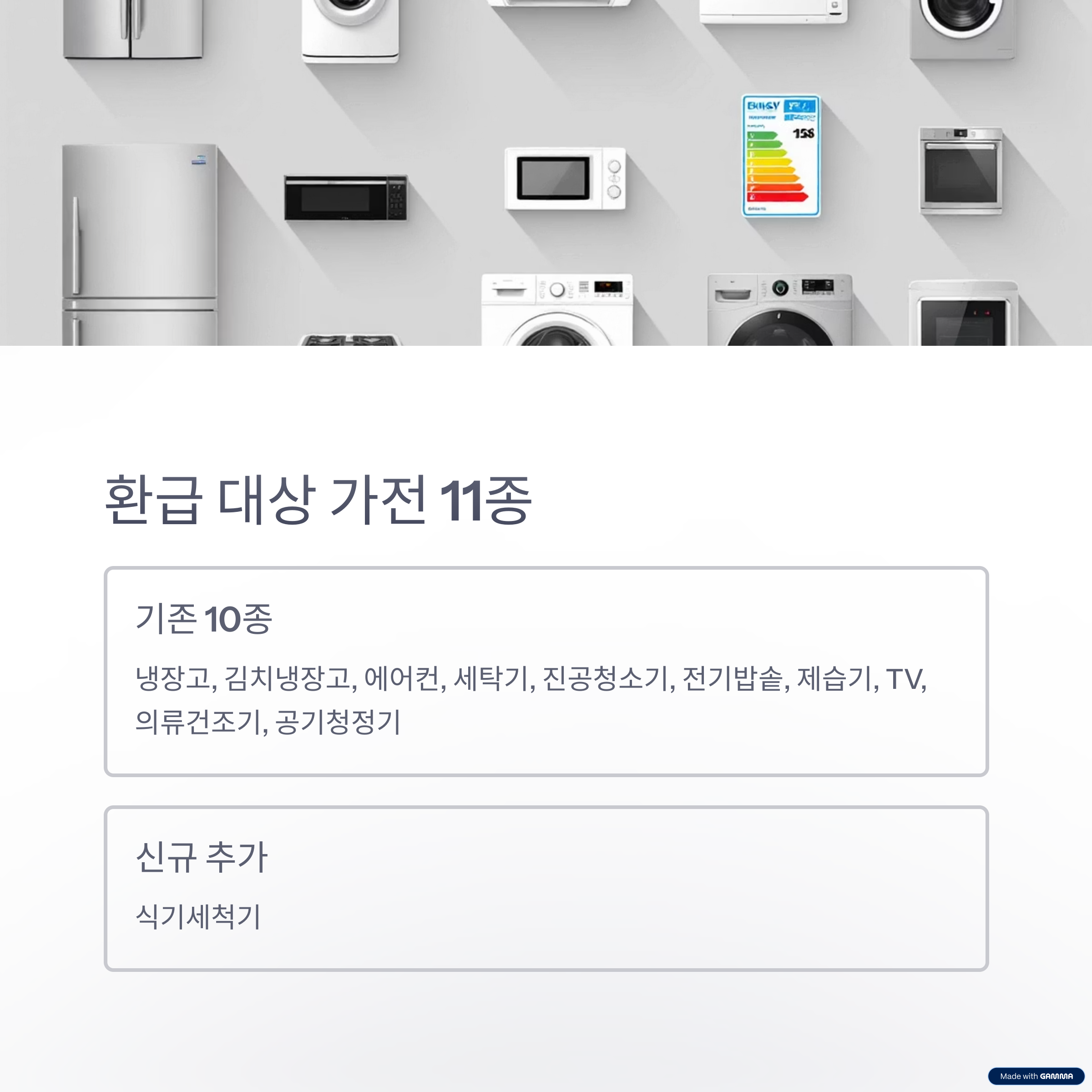 올해는 기존 10종에서 ‘식기세척기’가 추가되어 총 11개 품목이 환급 대상입니다.