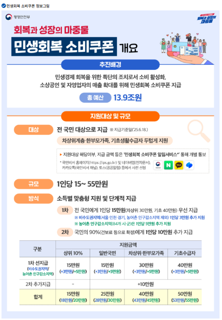 2025년 민생회복 소비쿠폰은 전 국민에게 1인당 최대 55만 원이 지급되는