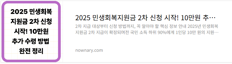 | 2025 민생회복지원금 2차 신청 시작! 10만원 추가 수령 방법 완전 정리 (2) | 2025.07.27 |