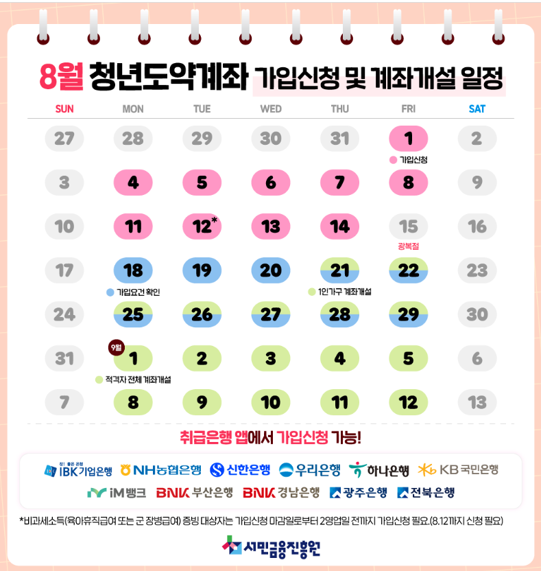2025년에도 청년 자산 형성을 위한 핵심 금융상품인 청년도약계좌에 대한 관심이 뜨겁습니다. 고금리와 정부 지원이 동시에 적용되는 이 적금은 특히 조건을 갖춘 청년이라면 반드시 챙겨야 할 제도인데요. 하지만 신청 기간이 매달 초 한정되어 있어 놓치기 쉽습니다. 특히 1인 가구는 추가 신청 기간이 따로 정해져 있어 더욱 주의가 필요합니다. 아래에서 2025년 청년도약계좌의 월별 신청 기간과 방법을 정확히 정리해 드립니다.