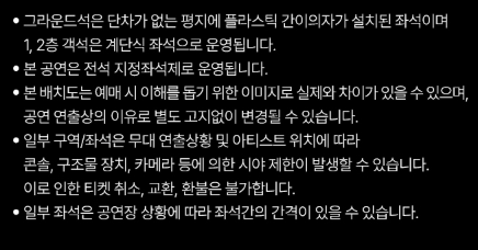 • 고객우선석은 현장감, 2층 중앙은 전체 무대와 조명 연출 감상을 원하는 분께 추천