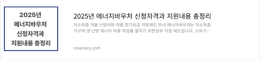 | 2025년 에너지바우처 신청자격과 지원내용 총정리 (3) | 2025.08.17 |