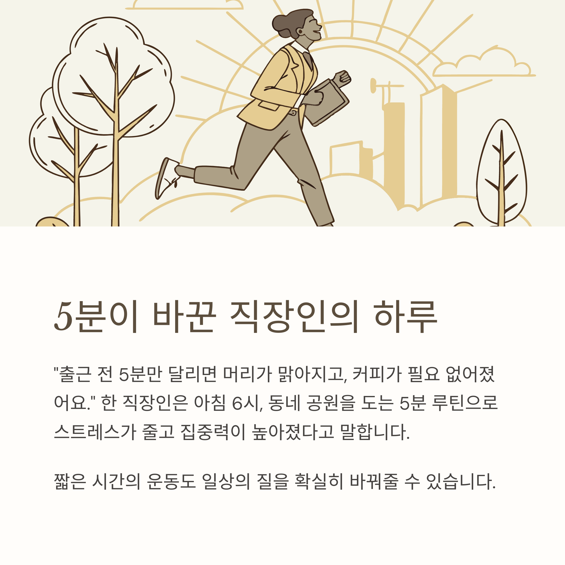 "출근 전 5분만 달리면 머리가 맑아지고, 커피가 필요 없어졌어요."