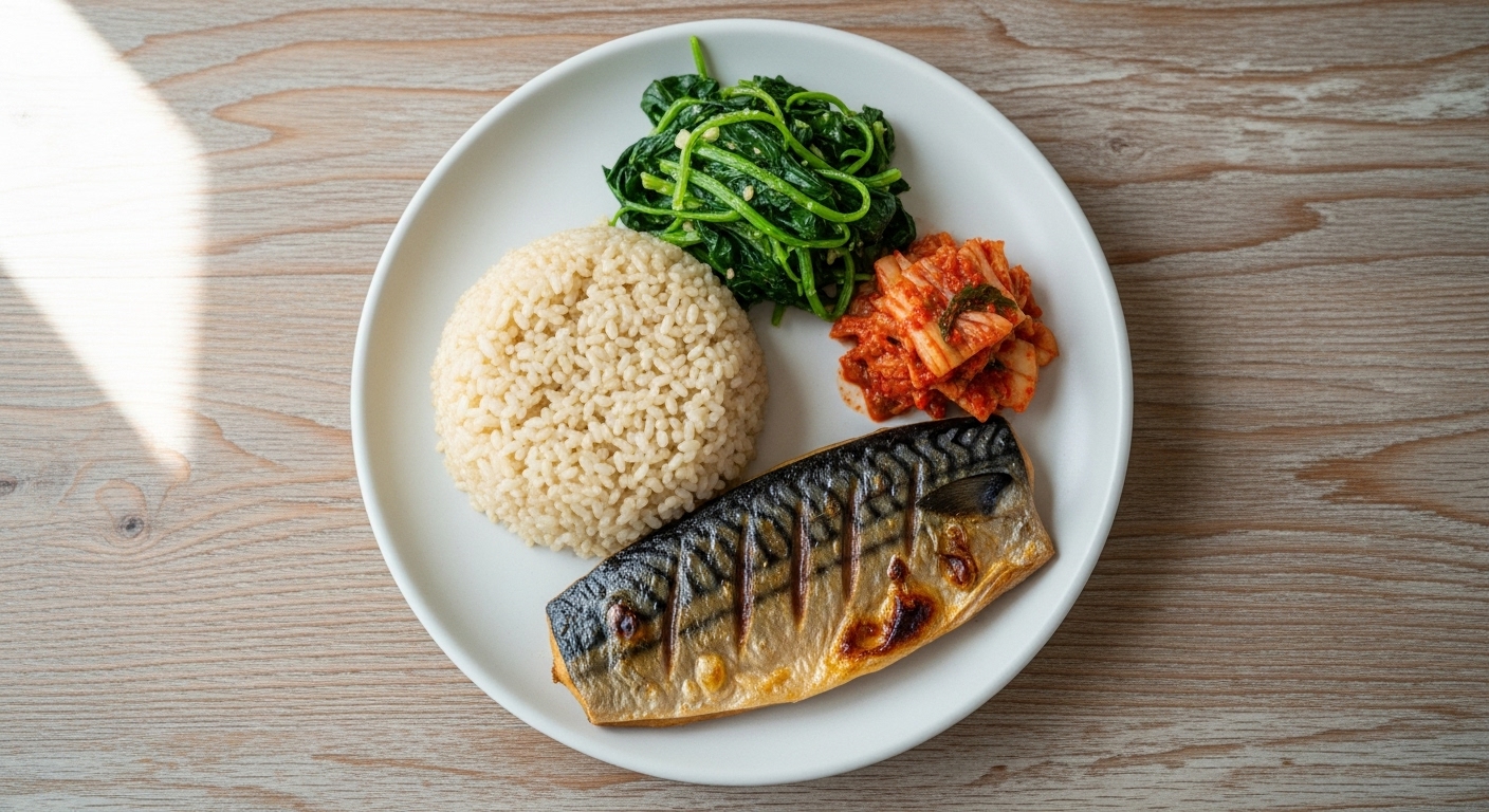 점심: 현미밥 + 고등어구이 + 시금치나물 + 김치