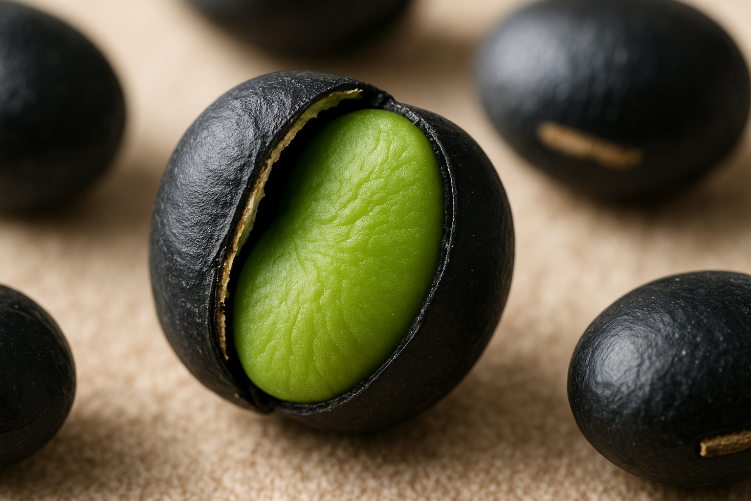 검은 껍질과 초록빛 속살이 특징인 국산 콩입니다.