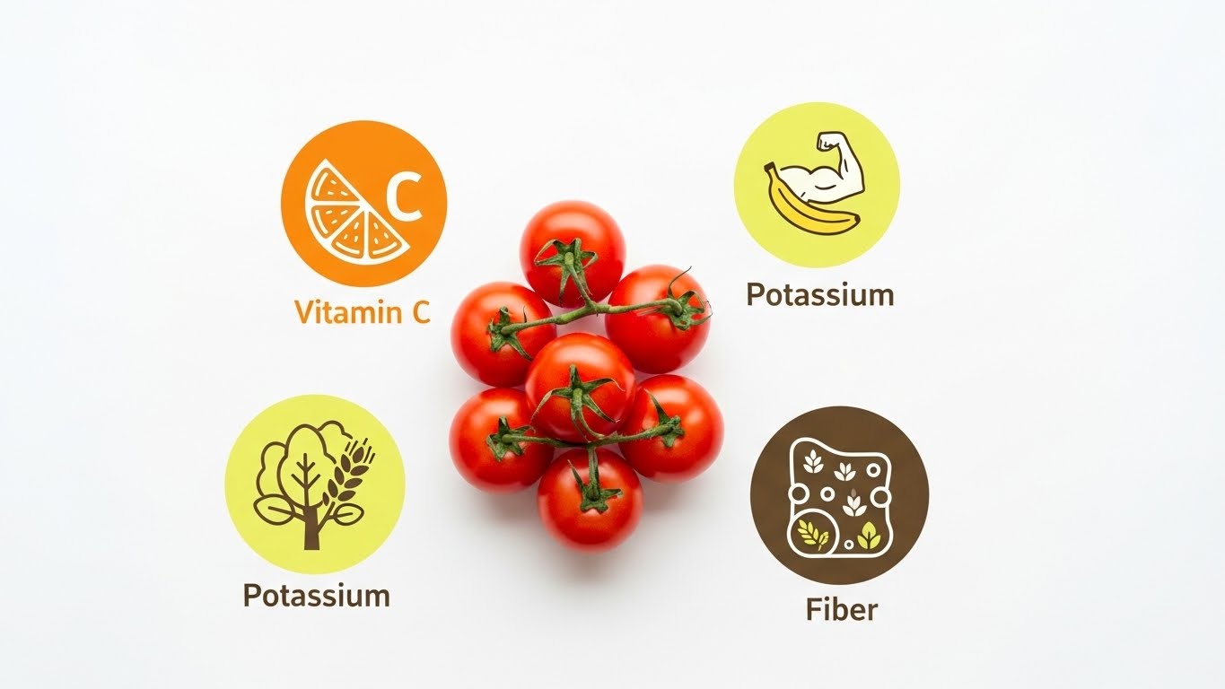 토마토의 식이섬유는 장운동 촉진, 변비 개선, 포만감 증가에 기여해요.