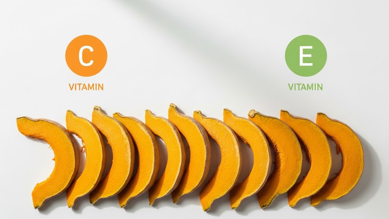 늙은호박에는 베타카로틴, 비타민 C, 비타민 E가 고루 들어 있습니다.