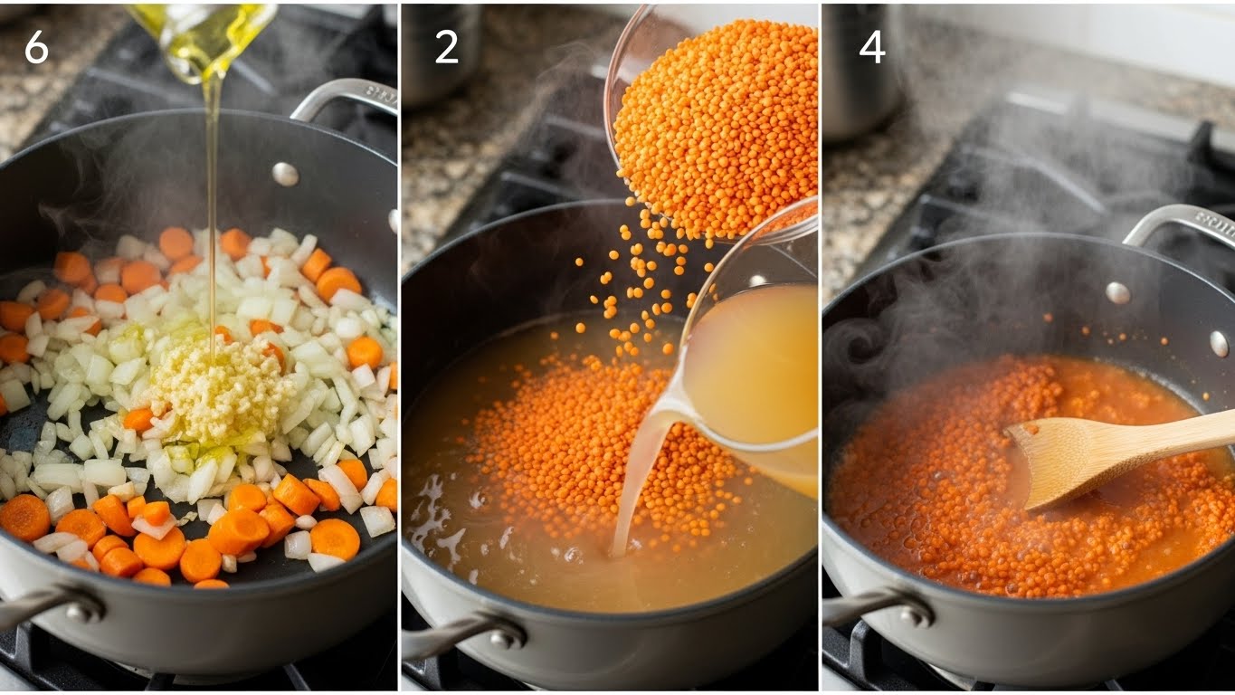 - 물과 레드 렌틸 넣고 15분 끓이기