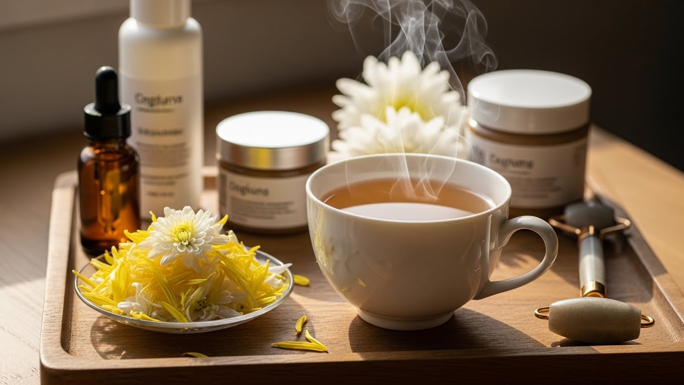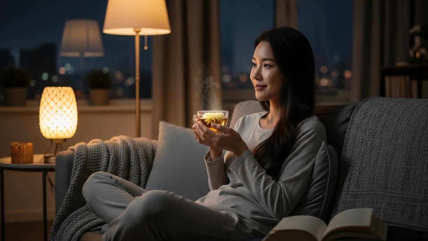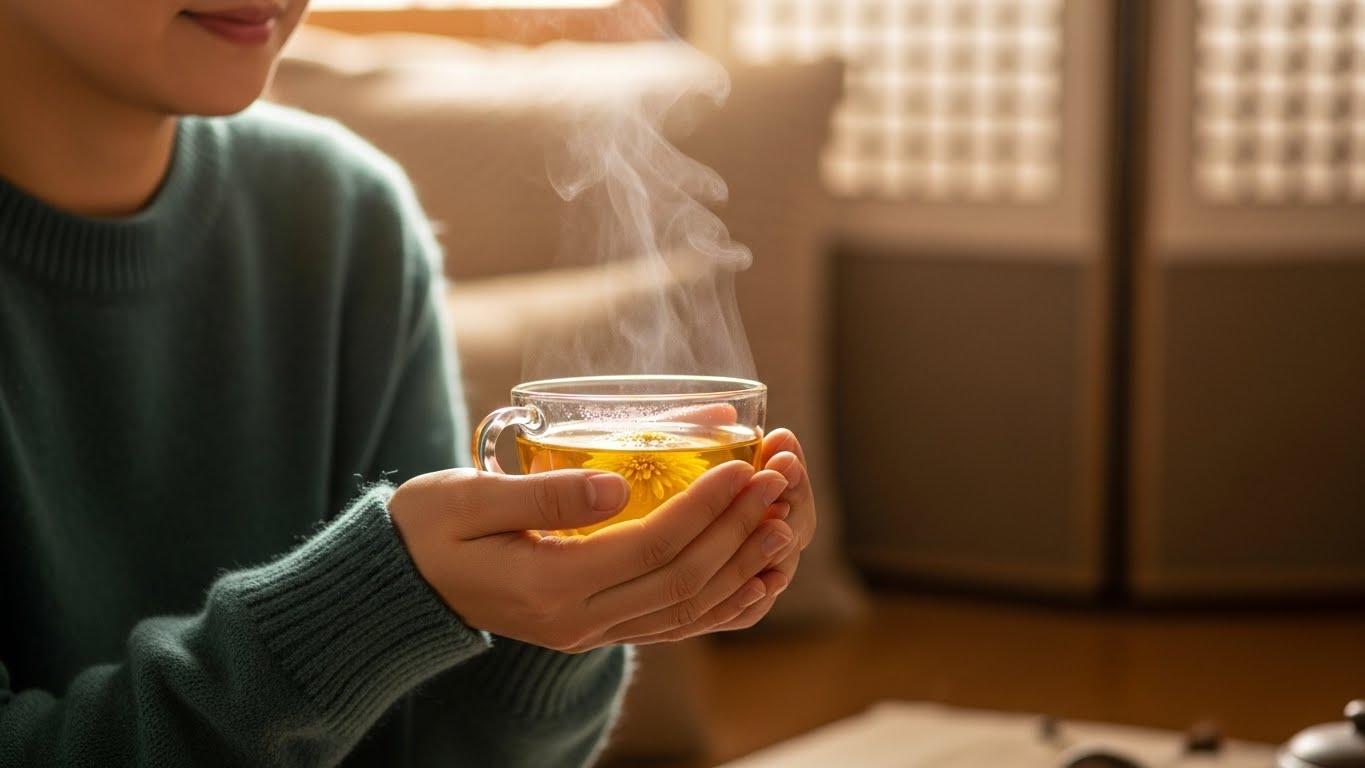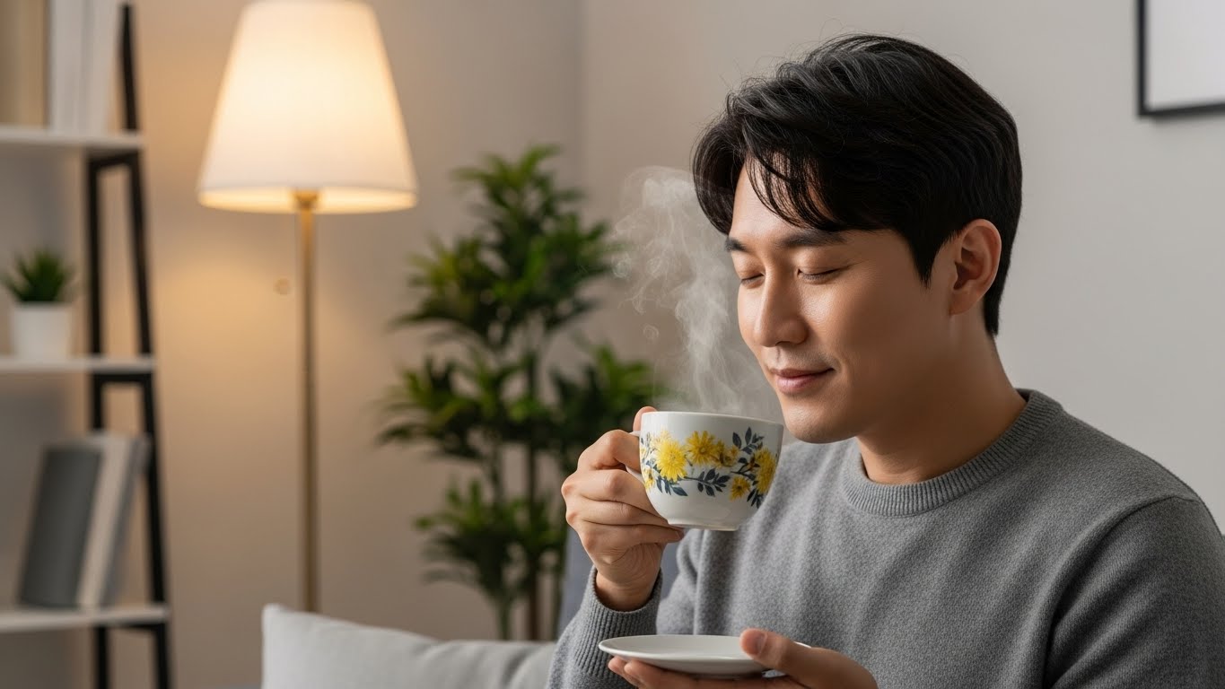 국화차는 부교감신경을 자극해 몸의 긴장을 완화시키는 효과가 있습니다. 스트레스로 인해 예민해지거나 쉽게 잠들지 못할 때 국화차는 천연 신경안정제 역할을 해줘요. 특히 자기 전 따뜻하게 우린 국화차 한 잔은 숙면을 도와 아침을 개운하게 맞이하게 해줍니다.