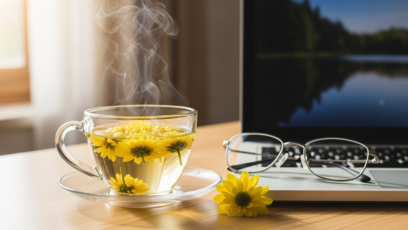 국화차는 눈의 피로를 풀어주고 시력을 보호하는 데 탁월한 효과가 있습니다. 한의학에서도 국화를 ‘간(肝)에 좋은 약재’로 여겼는데, 간 기능과 눈 건강은 밀접하게 연결되어 있기 때문입니다. 컴퓨터나 스마트폰 사용으로 눈이 뻑뻑하고 침침할 때 국화차를 마시면 눈이 맑아지고 시야가 개운해지는 느낌을 받을 수 있어요.