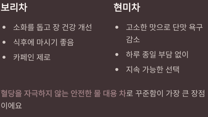 혈당 관리가 필요한 분들 중에는 카페인에 민감한 경우도 많아요. 이런 분들에게는 보리차나 현미차가 정말 좋은 대안이 될 수 있어요. 이 두 가지 차는 혈당을 직접적으로 낮추는 기능성 차라기보다는, 혈당을 자극하지 않는 안전한 물 대용 차에 가까워요. 보리차는 소화를 돕고 장을 편안하게 해주는 느낌이 있어서 식후에 마시기 좋고, 현미차는 고소한 맛 덕분에 단맛에 대한 욕구를 줄이는 데 도움이 돼요. 무엇보다 중요한 건, 설탕이나 향료가 전혀 들어가지 않아 하루 종일 마셔도 부담이 없다는 점이에요. 당뇨에 좋은 차를 찾다가 너무 기능성만 따지다 보면 오히려 꾸준함을 놓치기 쉬운데, 이런 차들은 ‘지속 가능성’이라는 측면에서 아주 큰 장점이 있어요. 물 대신 자연스럽게 마실 수 있는 차를 찾는다면, 이 두 가지는 꼭 후보에 넣어보세요.