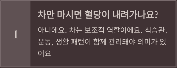 A. 아니에요. 차는 어디까지나 보조적인 역할이에요. 식습관, 운동, 생활 패턴이 함께 관리돼야 의미가 있어요.