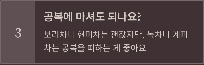 A. 보리차나 현미차처럼 자극 없는 차는 괜찮지만, 녹차나 계피차는 공복을 피하는 게 좋아요.