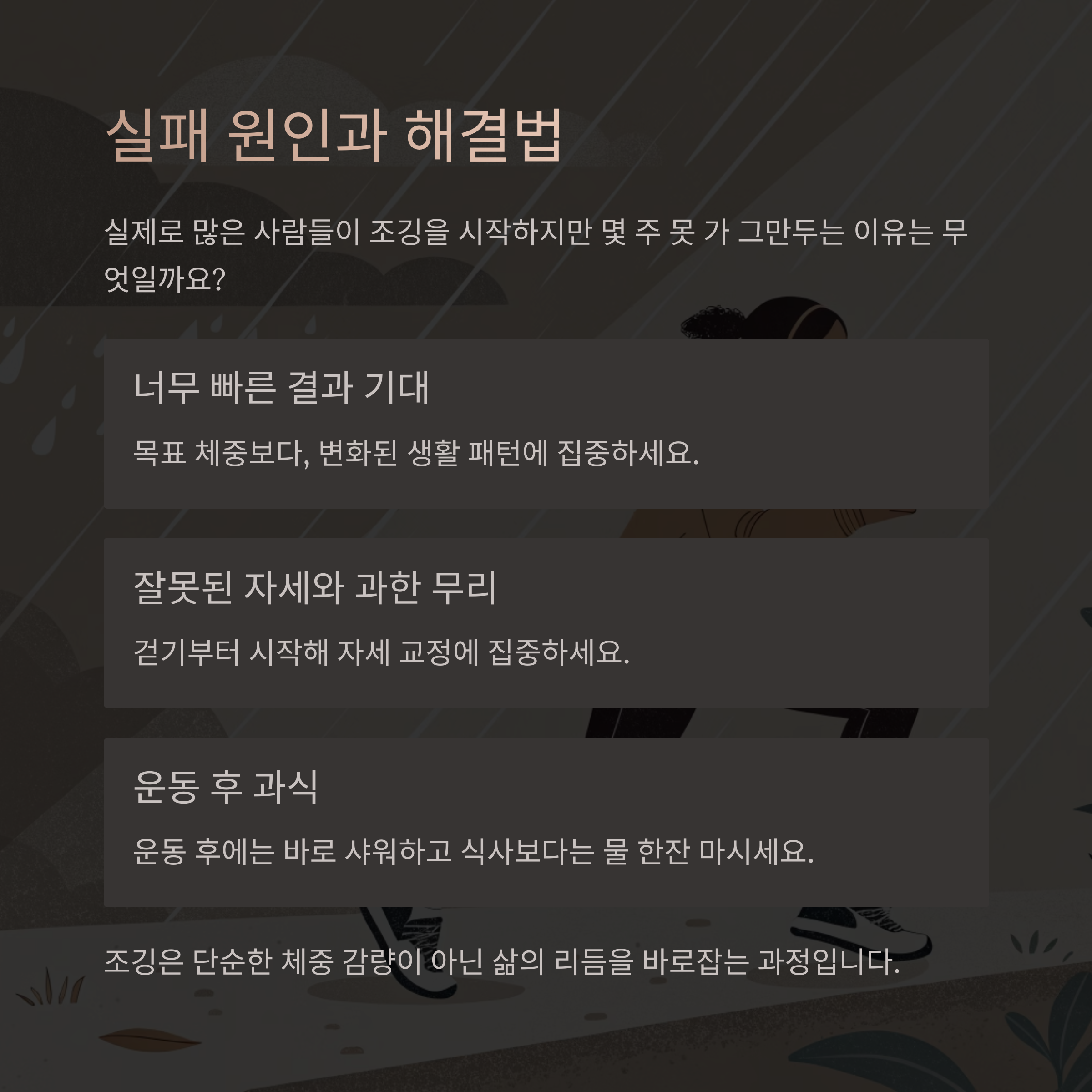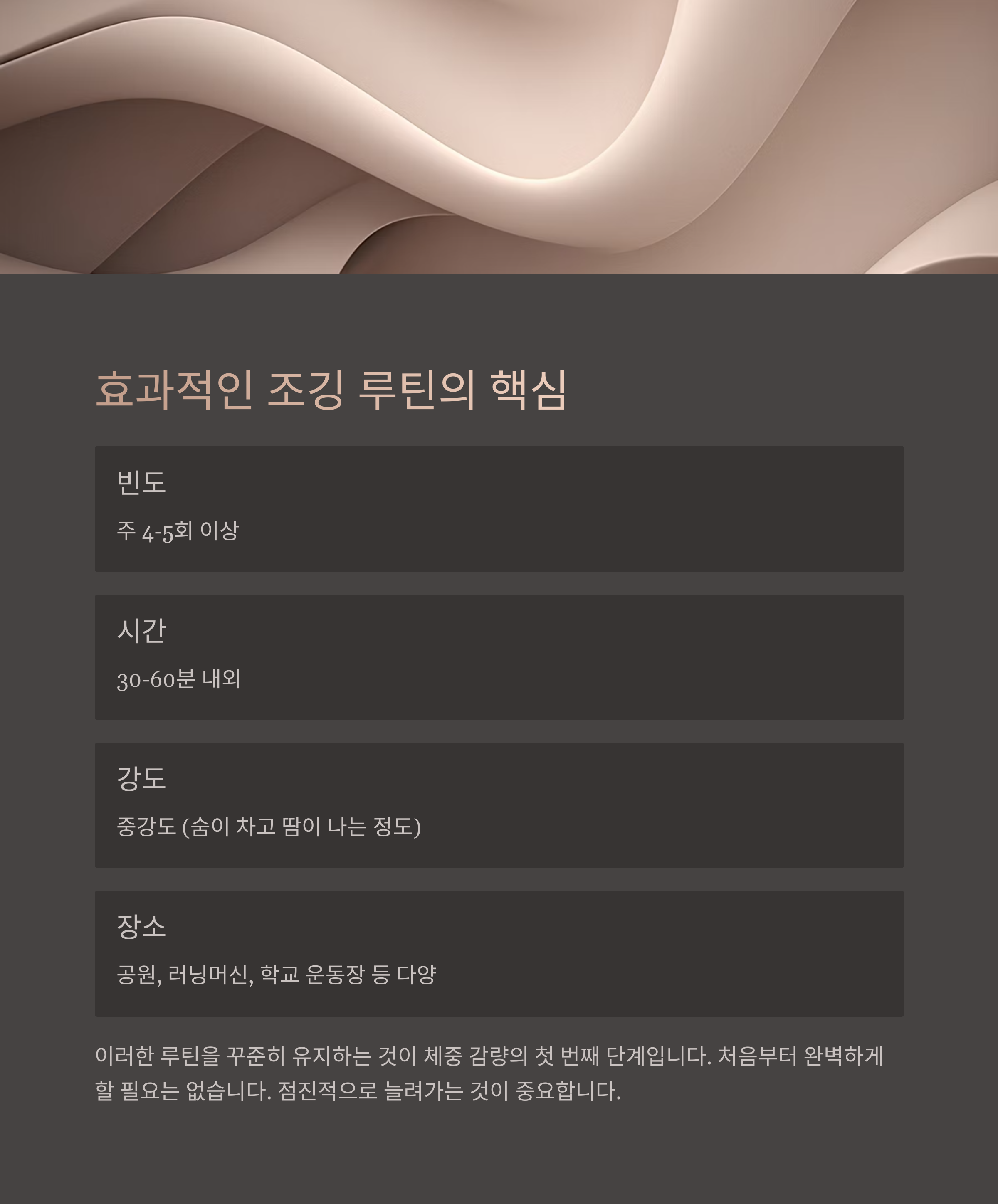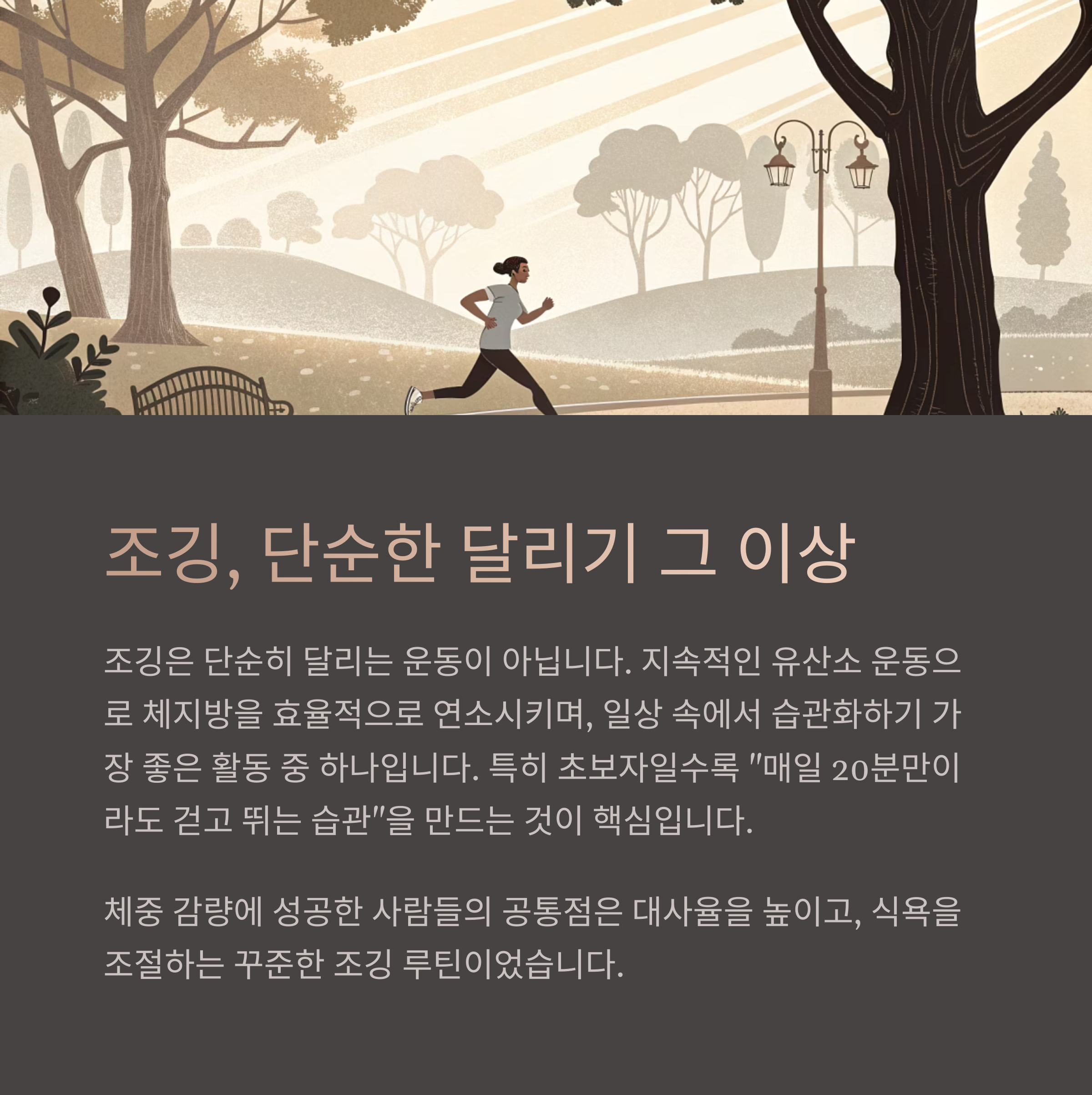 이처럼 조깅은 단순한 체중 감량이 아닌 삶의 리듬을 바로잡는 과정입니다.