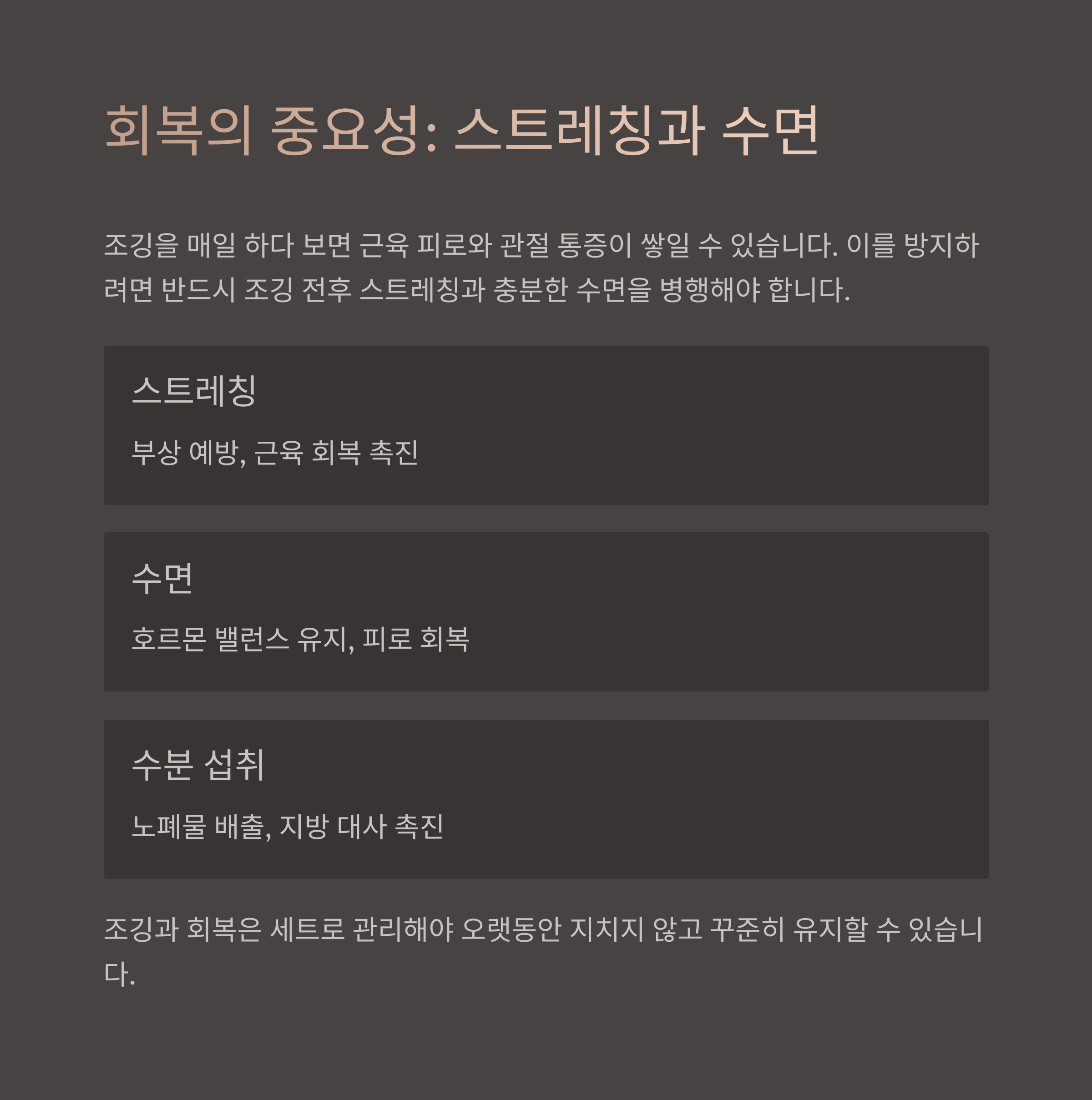이를 방지하려면 반드시 조깅 전후 스트레칭충분한 수면을 병행해야 합니다.