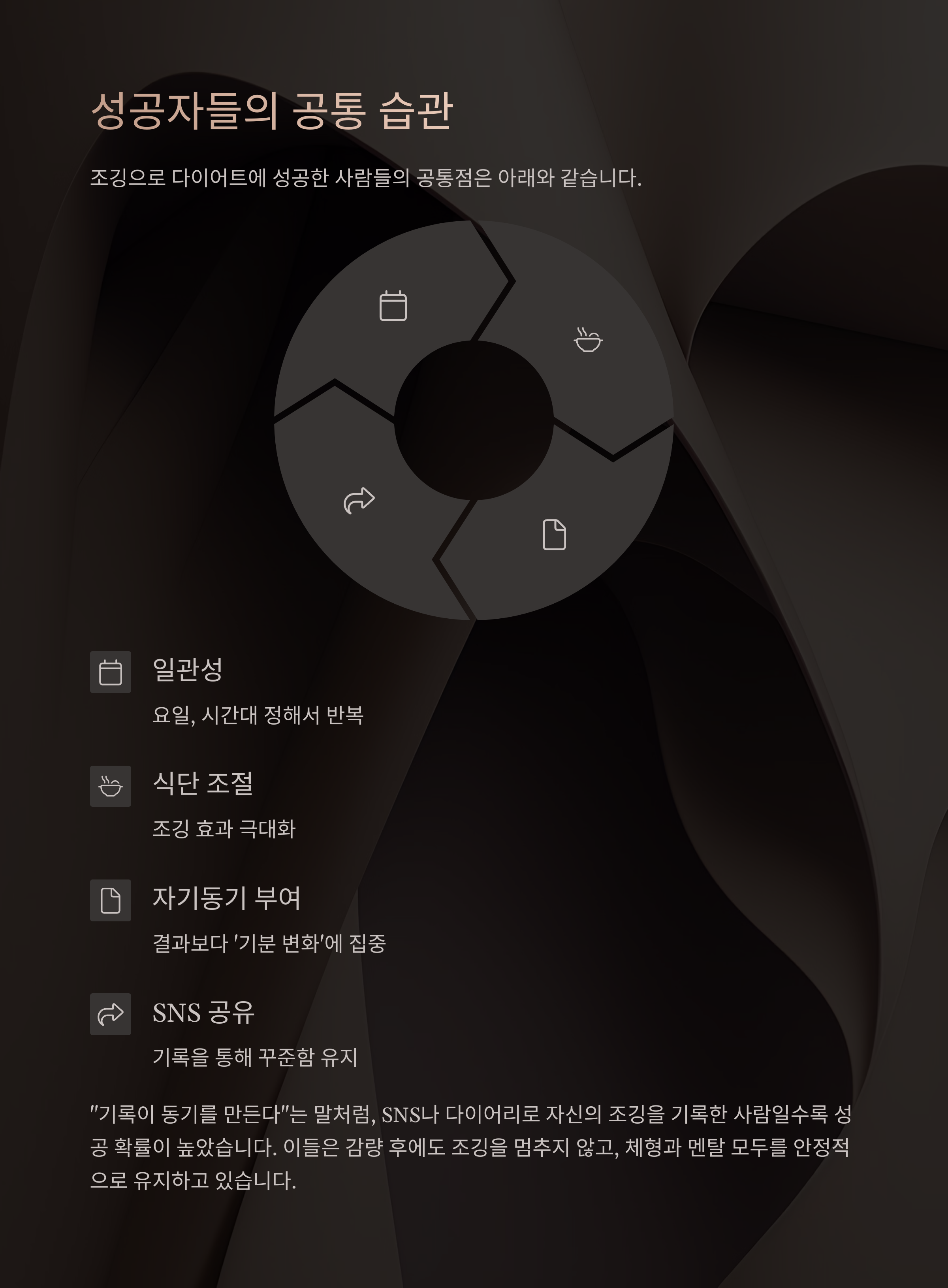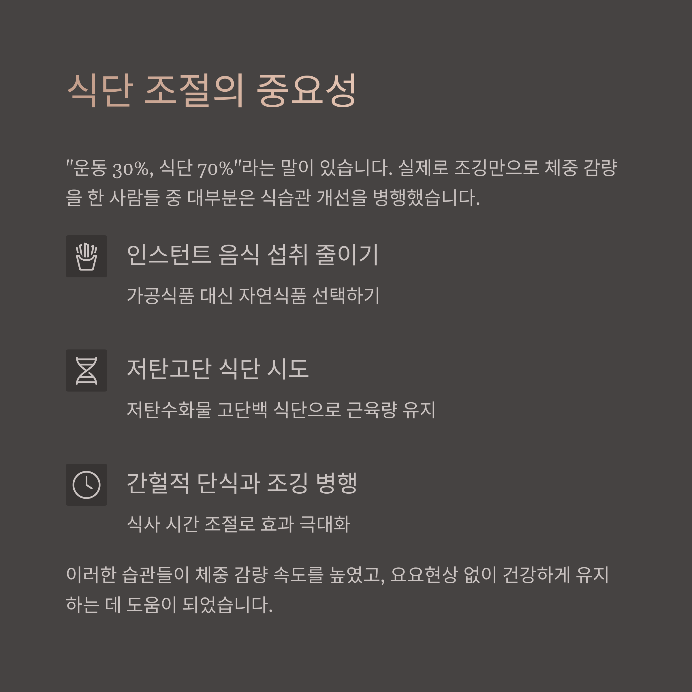 이러한 습관들이 체중 감량 속도를 높였고, 요요현상 없이 건강하게 유지하는 데 도움이 되었습니다.