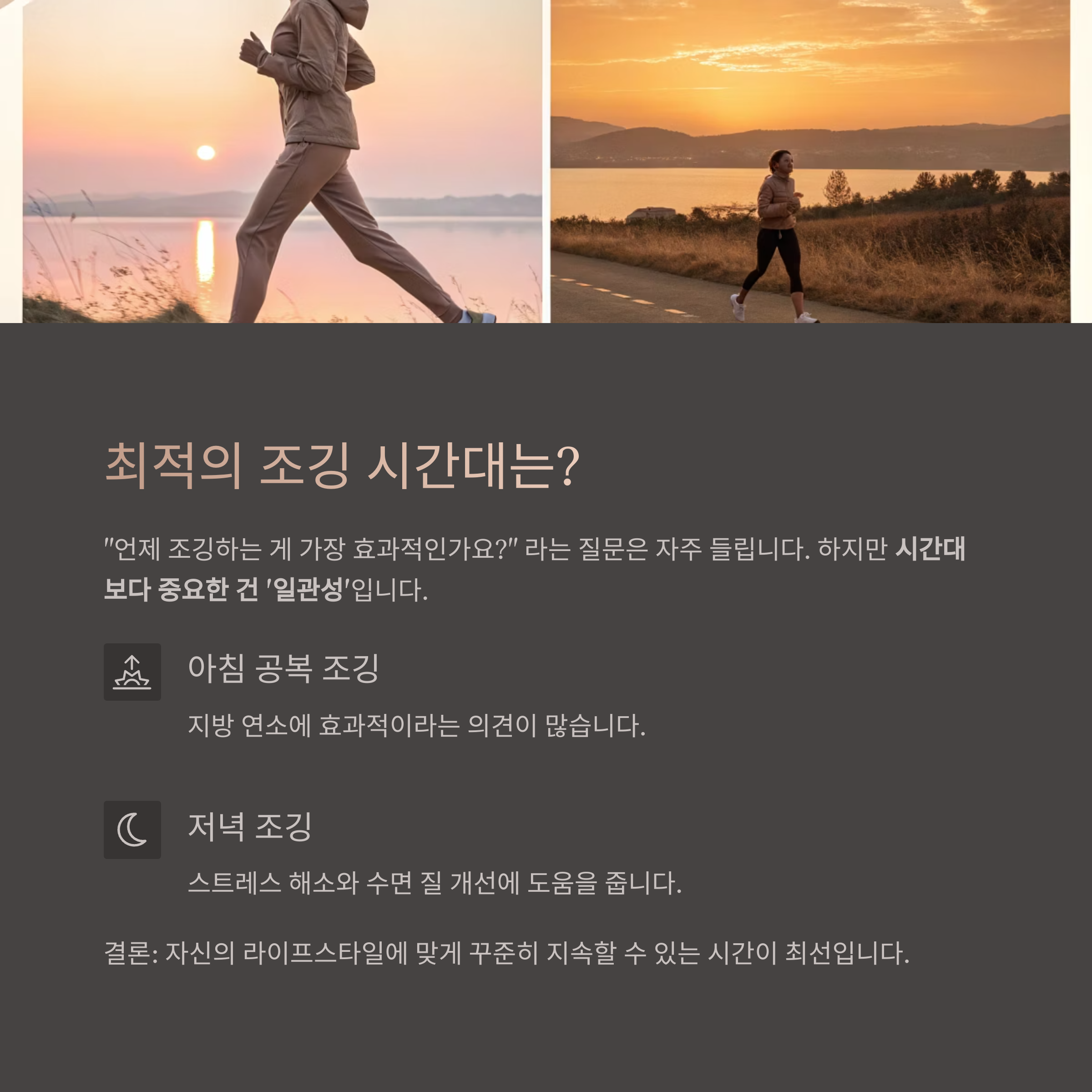 반면, 퇴근 후 저녁 조깅은 스트레스 해소와 수면 질 개선에 도움을 줍니다.