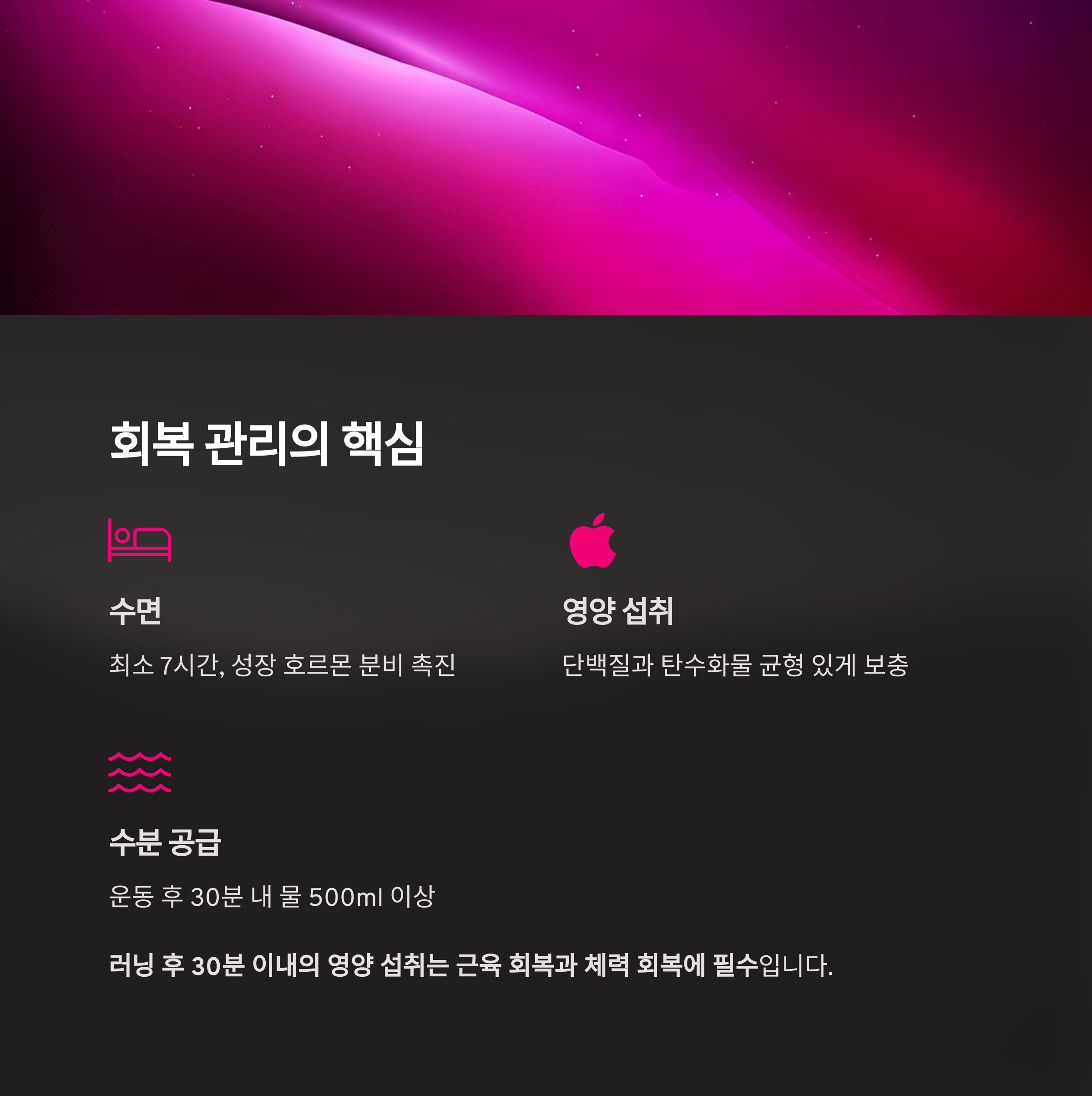 | 수분 공급 | 운동 후 30분 내 물 500ml 이상 |
