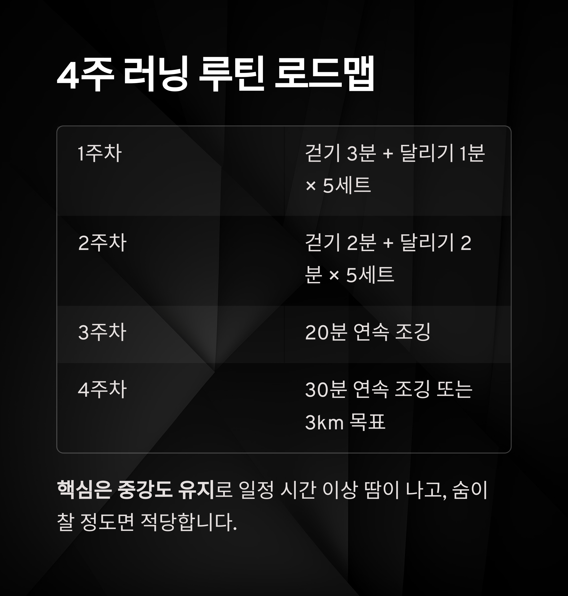 | 4주차 | 리듬 조절 & 거리 확대 | 30분 연속 조깅 또는 3km 목표 |