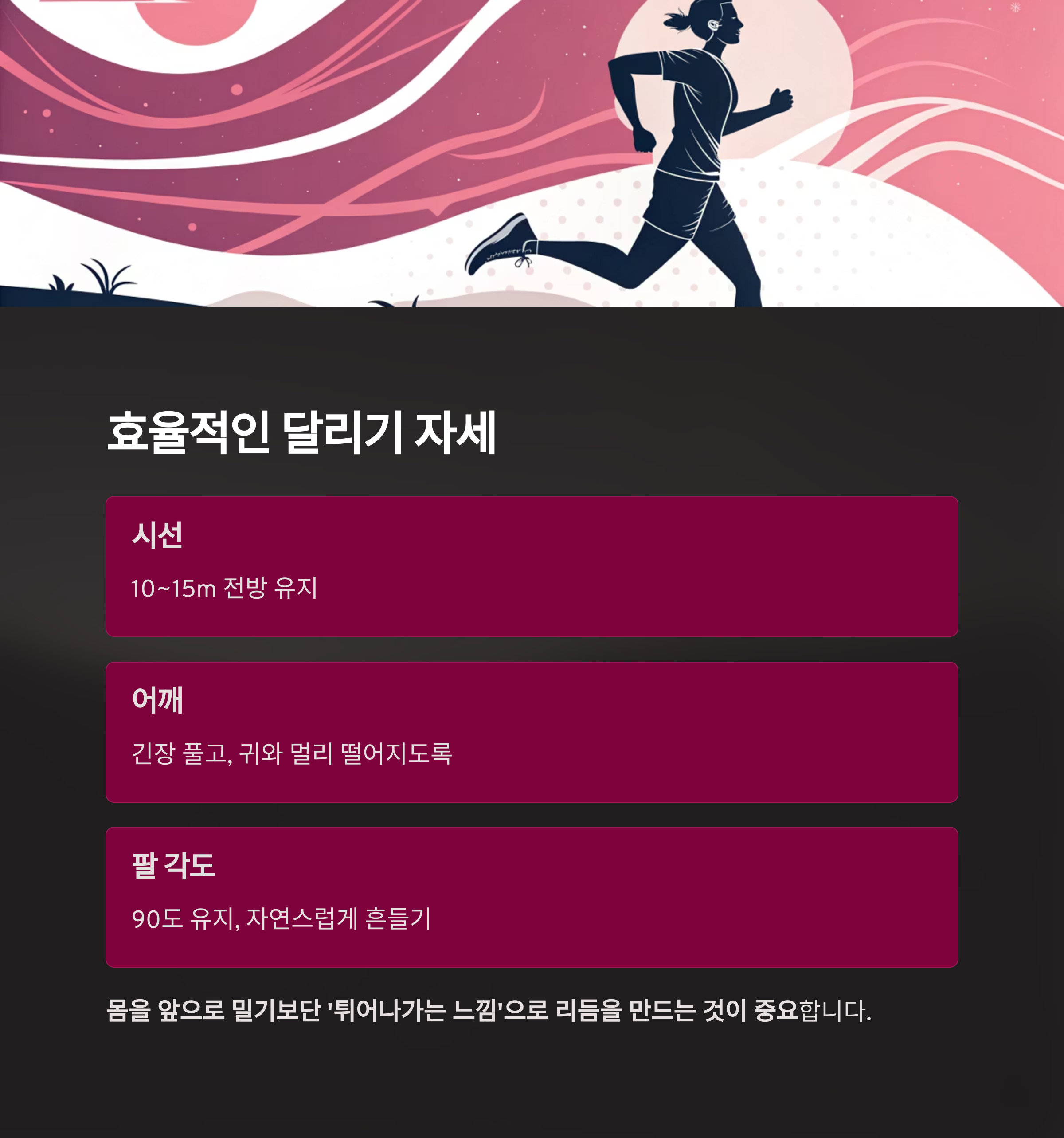 올바른 러닝 자세는 체력 소모를 줄이고, 속도와 거리 유지에 효과적입니다.