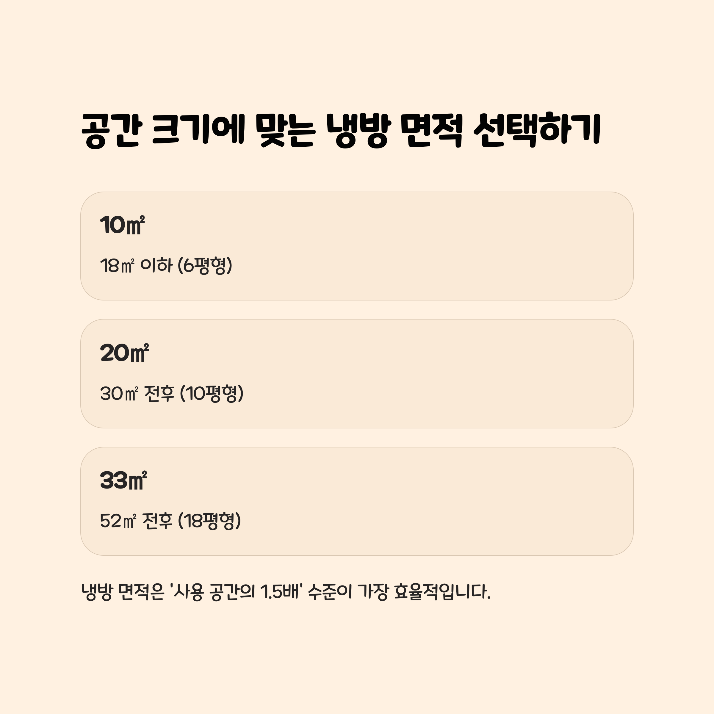핵심: 냉방 면적은 '사용 공간의 1.5배' 수준이 가장 효율적입니다.