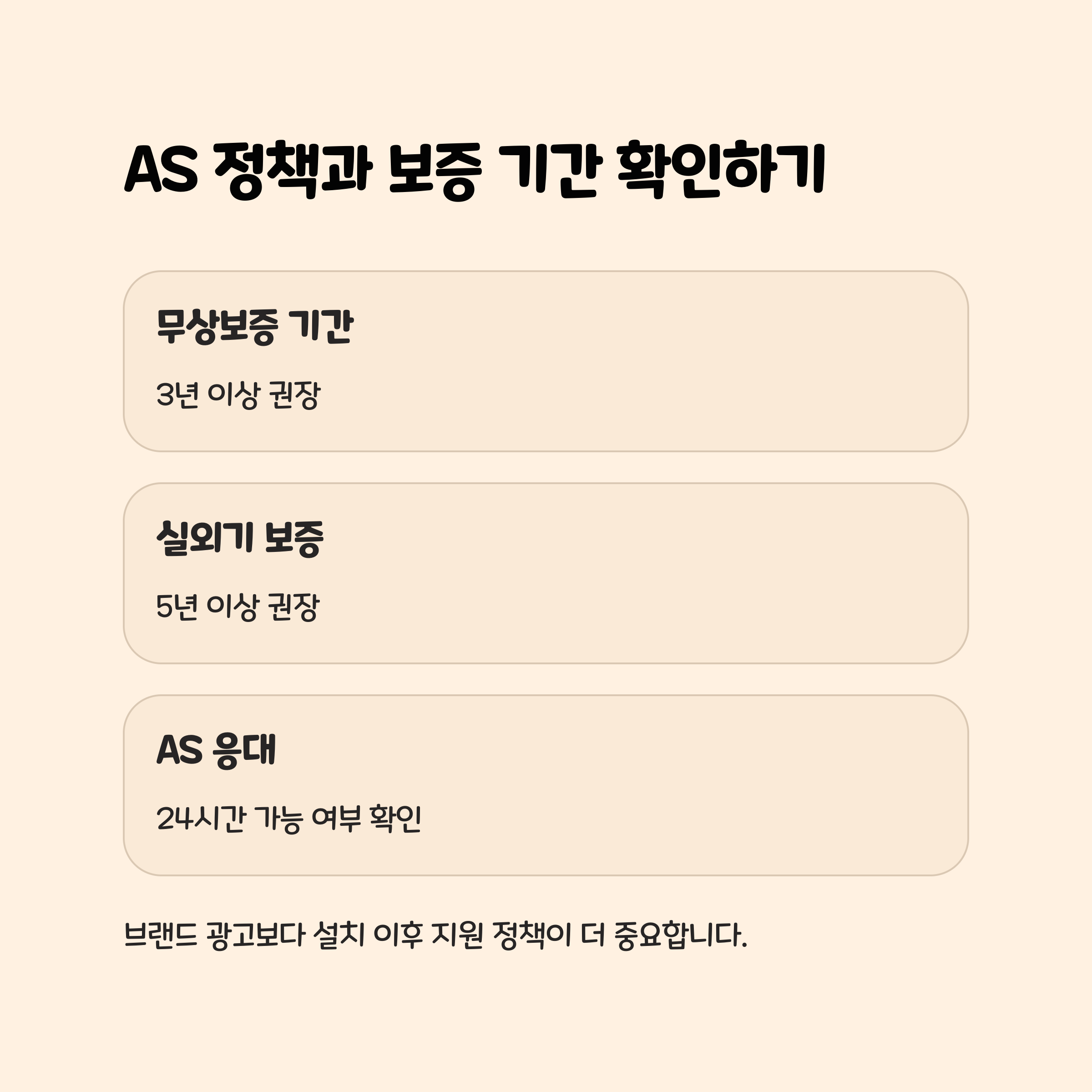 따라서 브랜드보다 AS 응답 속도, 무상보증 기간, 설치기사 품질이 중요합니다.