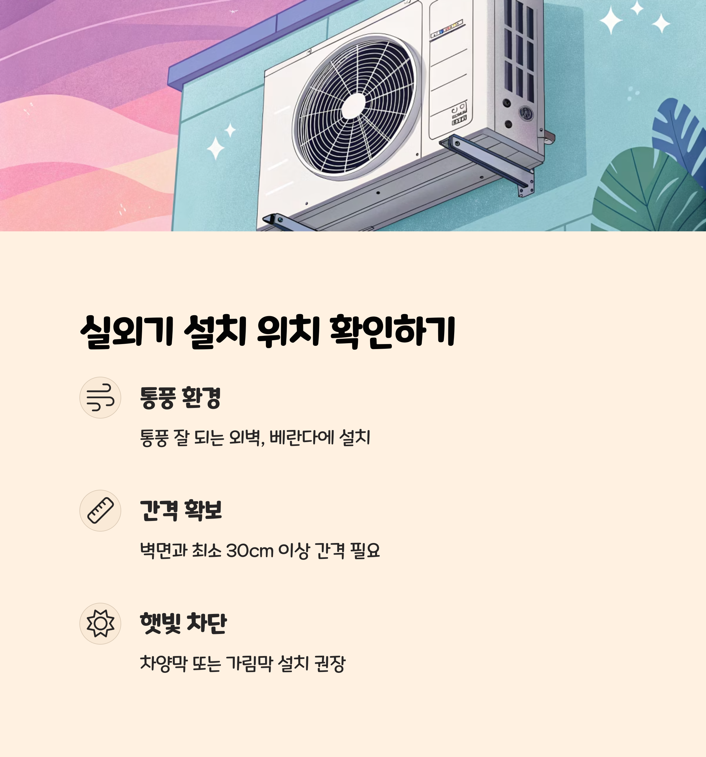 - 실외기 간격: 벽면과 최소 30cm 이상 확보