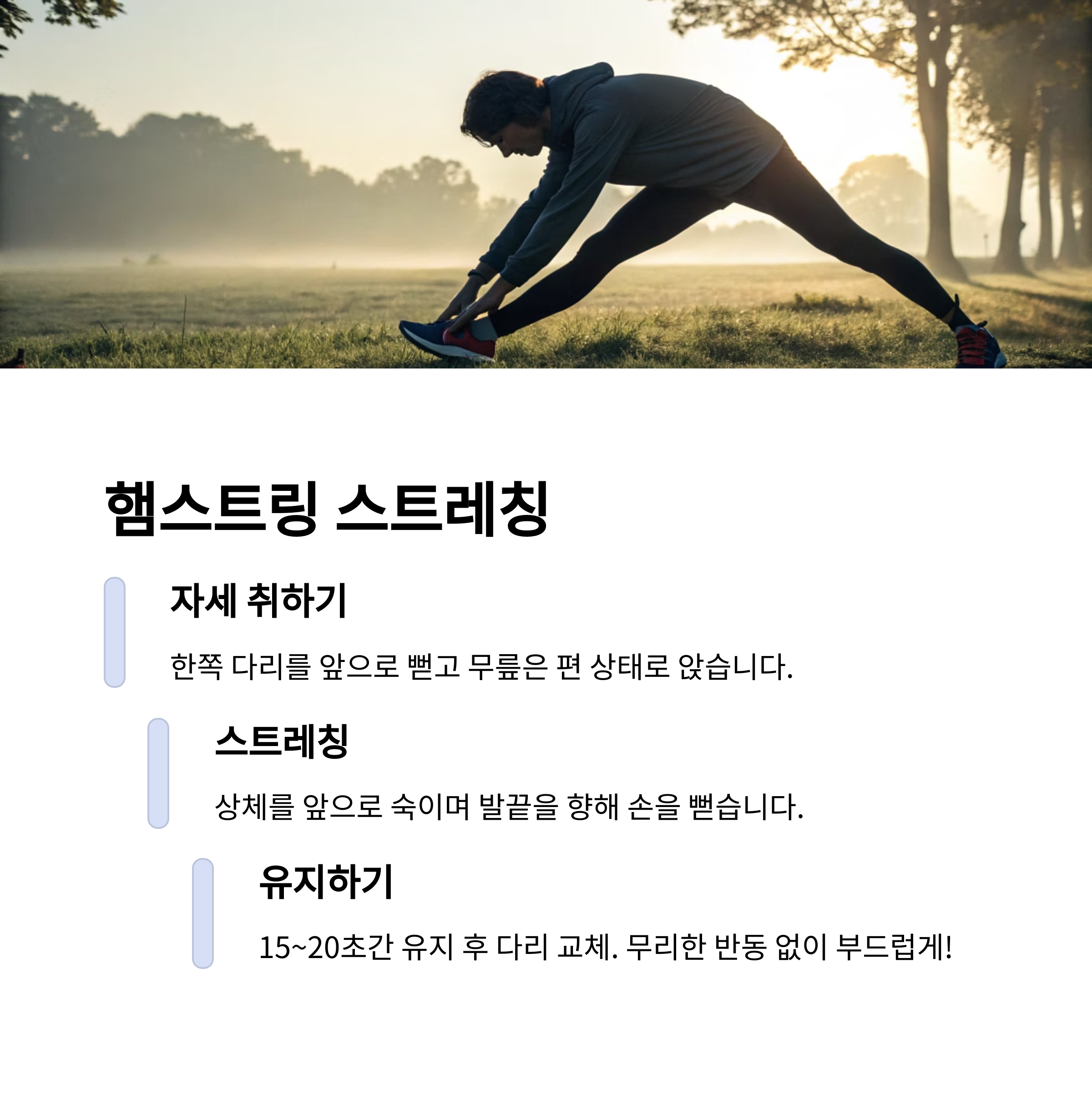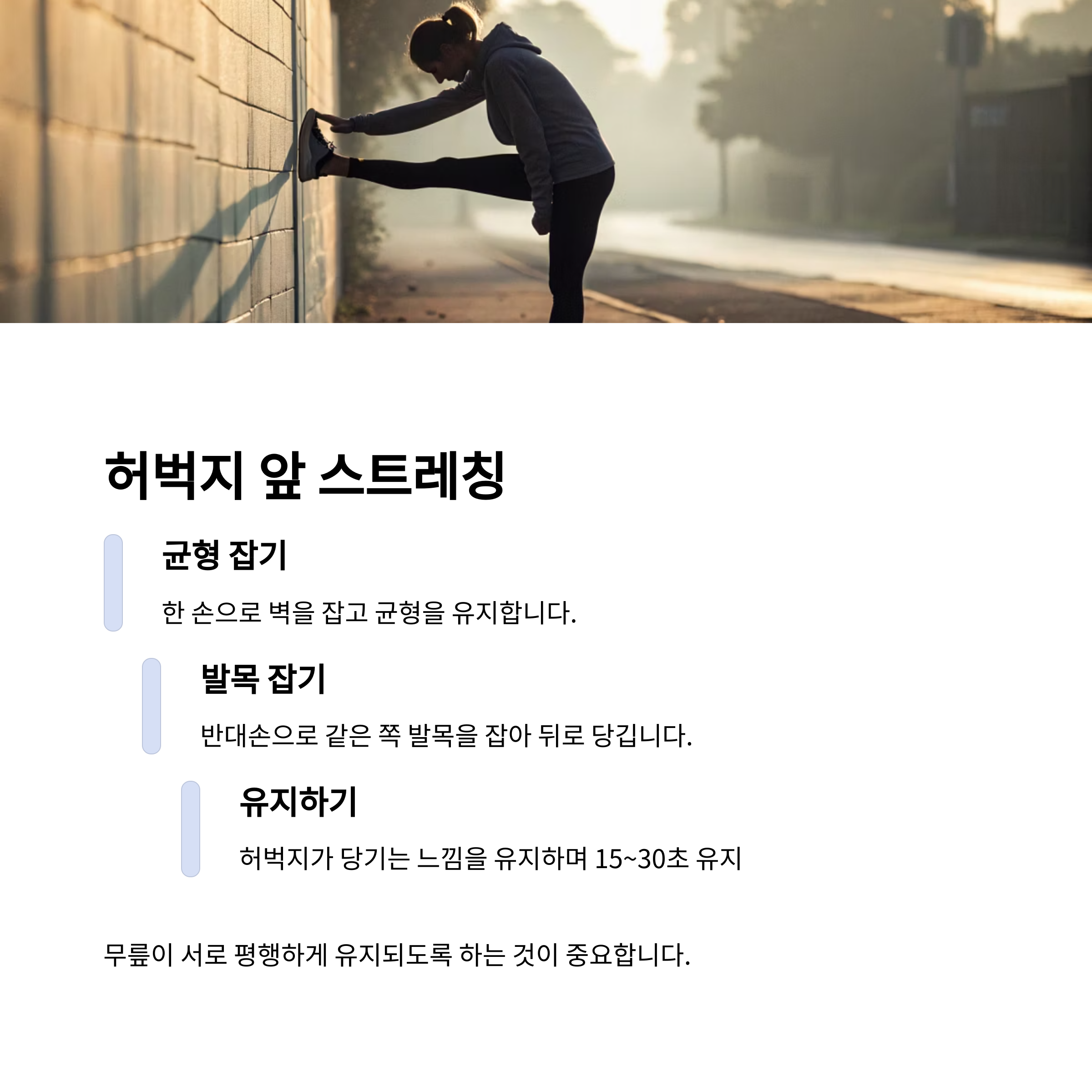 핵심: 무리한 반동 없이 부드럽게 스트레칭하는 것이 중요합니다.